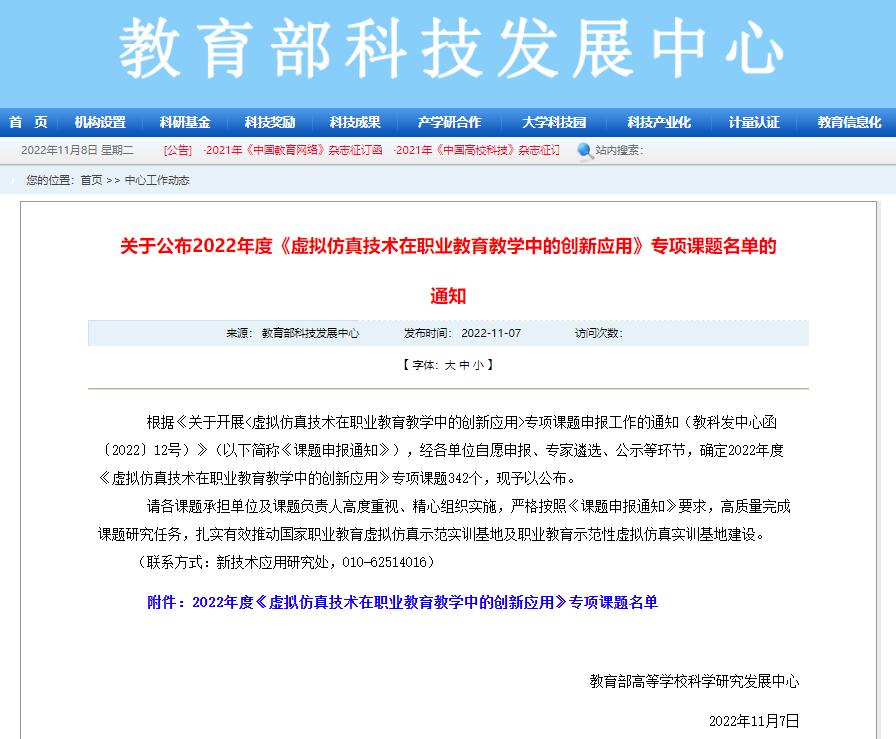 据悉,此次教育部高等学校科学研究发展中心立项一批《虚拟仿真技术在职业教育教学中的创新应用》专项课题,旨在助力职业教育数字化升级,探索虚拟仿真赋能职业教育教学的新思路、新模式、新机制,进一步推动国家职业教育虚拟仿真示范实训基地及职业教育示范性虚拟仿真实训基地建设。