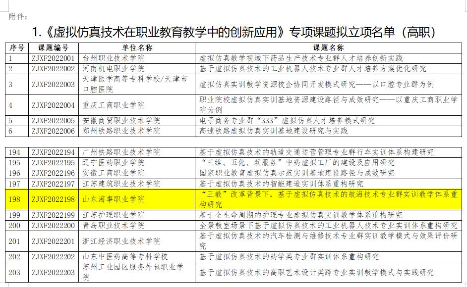 11月7日,教育部发布《关于公布2022年度<虚拟仿真技术在职业教育教学中的创新应用>专项课题名单的通知》,jinnianhui金年会诚信至上申报的《“三教”改革背景下,基于虚拟仿真技术的航海技术专业群实训教学体系重构研究》获批立项。