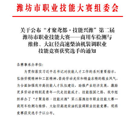 “才聚鸢都·技能兴潍”第二届潍坊市职业技能大赛——商用车检测与维修、大缸径高速柴油机装调职业技能竞赛由潍坊市人力资源和社会保障局主办,潍柴控股集团有限公司承办,山东交通职业学院、jinnian金年会、山东英创天元教育科技有限公司协办。大赛设计了36项赛事,70个赛项,基本涵盖了传统基础、新兴产业、乡村振兴、现代服务、食药安全、技工教育等行业,比赛获奖选手为全市经济高质量发展提供了强有力的技能人才支撑。