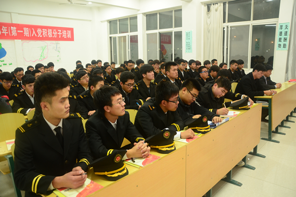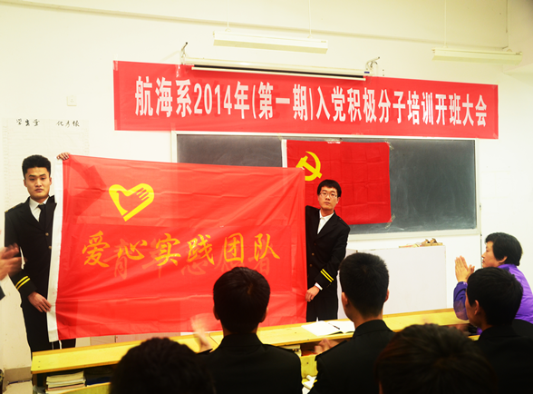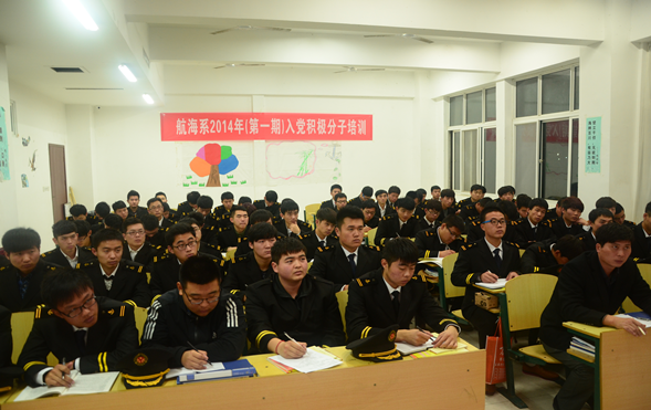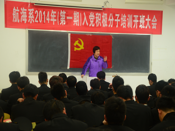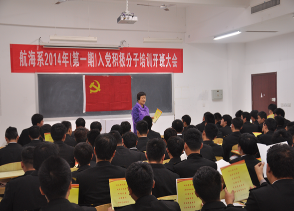 航海系2014年(第一期)入党积极分子培训班于11月28晚正式开班了。会场悬挂党旗,气氛郑重热烈;参训人员穿着整齐,精神饱满。参加这次培训的是三个年级的72名学员,他们都是各年级推荐的优秀团员,也是党支部确定培养的入党积极分子,他们将正式以一名入党积极分子的身份贴近党组织。