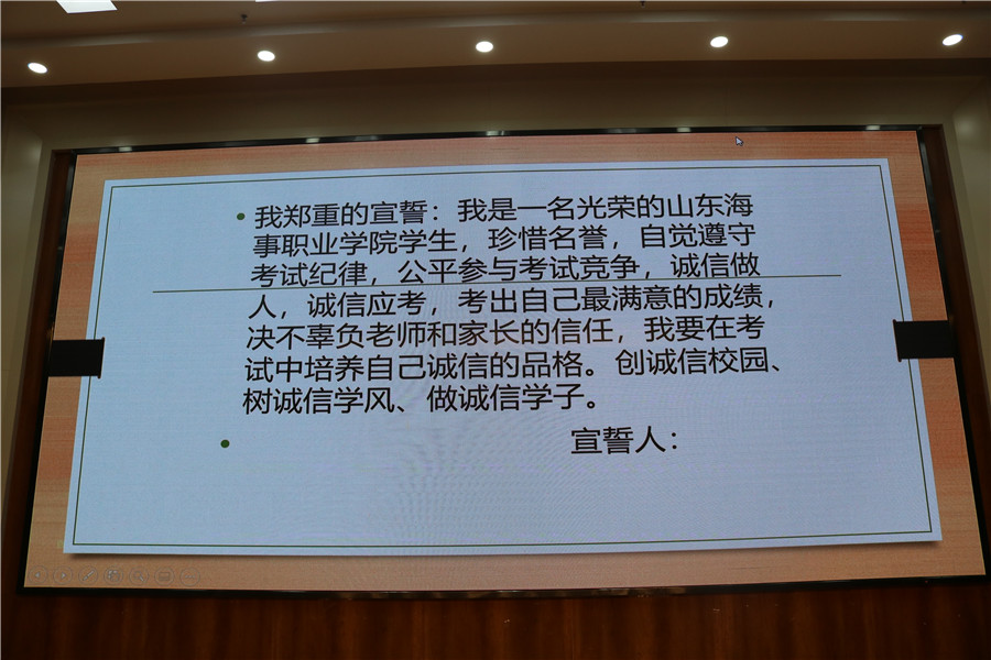 班会上,张老师从“诚信”的含义出发,结合实际案例向同学们讲述了考试作弊的危害和严重后果,以及如何做到诚信应考。同时,张老师对同学们的学习情况进行了解,并提出了一些复习安排。要求大家在考试周,认真、坚持上晚自习,系统全面的复习所学知识,全身心的投入复习。班会最后由2017级冷雪超同学带领全体同学进行了诚信应考宣誓。