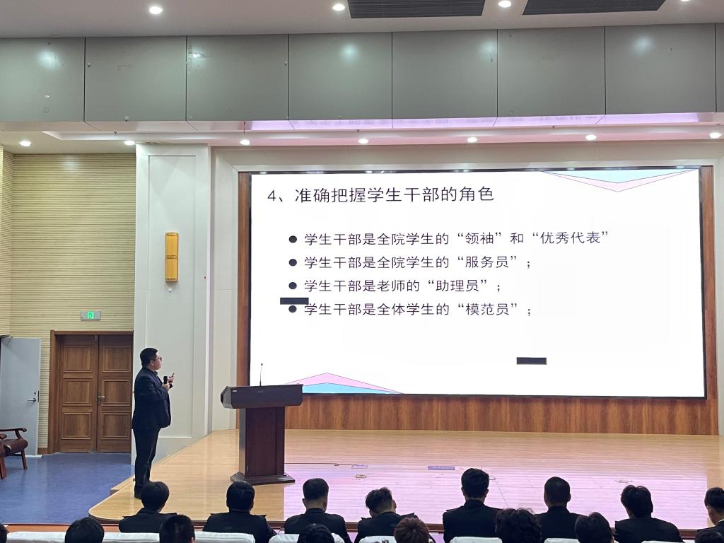 开班仪式结束后,张老师为学生干部作《如何成为一名优秀的学生干部》专题讲座。讲座中张老师从“学生干部的角色和定位、学生干部应该具备的素质和能力、学生干部应该处理好的几个关系、关于我院学干部的一些思考”四个方面深入浅出地讲授,系统地为学生讲授了学生干部应该做好角色定位,达到一个原则、两个重点(双强双优)、四个方面的优秀学生干部标准,通过一个个生动的案例指出学生干部应该具备的九种能力和五个素质,告诉学生如何处理好工作与学习、同学、老师、奖励之间的关系。培训最后张老师用“珍惜在学生干部的时间、把握在学生干部的机会、实现在学生干部的发展”三句话来勉励学生干部,进而更好地服务全体学生的成长发展。