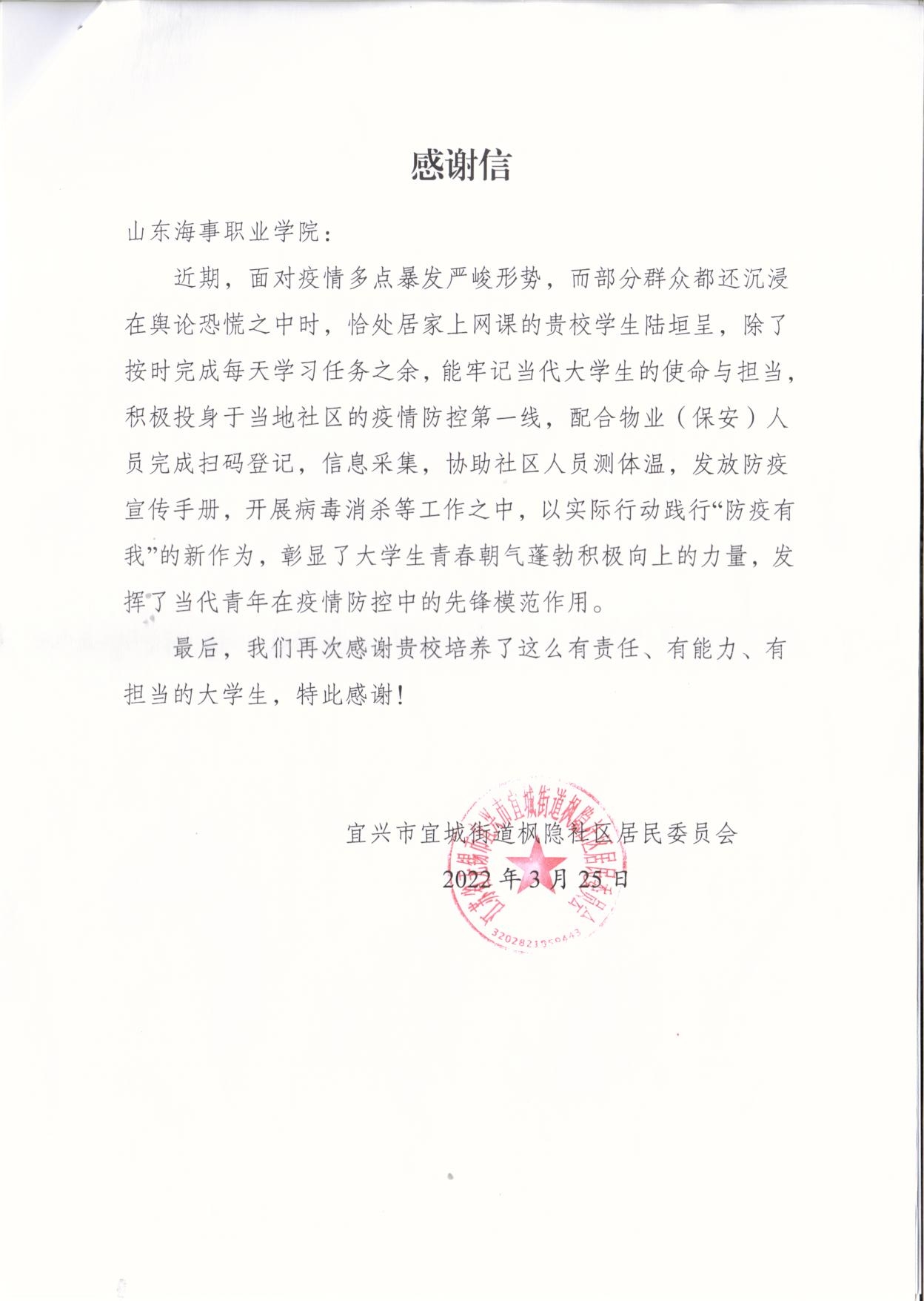 他是这一个朴实无华,平凡的大学生,收到了来自宜兴市宜城街道枫隐社区的感谢信,感谢信中肯定了金年会学子有责任、有能力、有担当。在疫情面前,用实际行动践行新时代大学生的使命与担当。