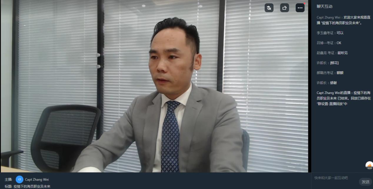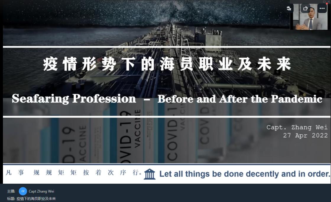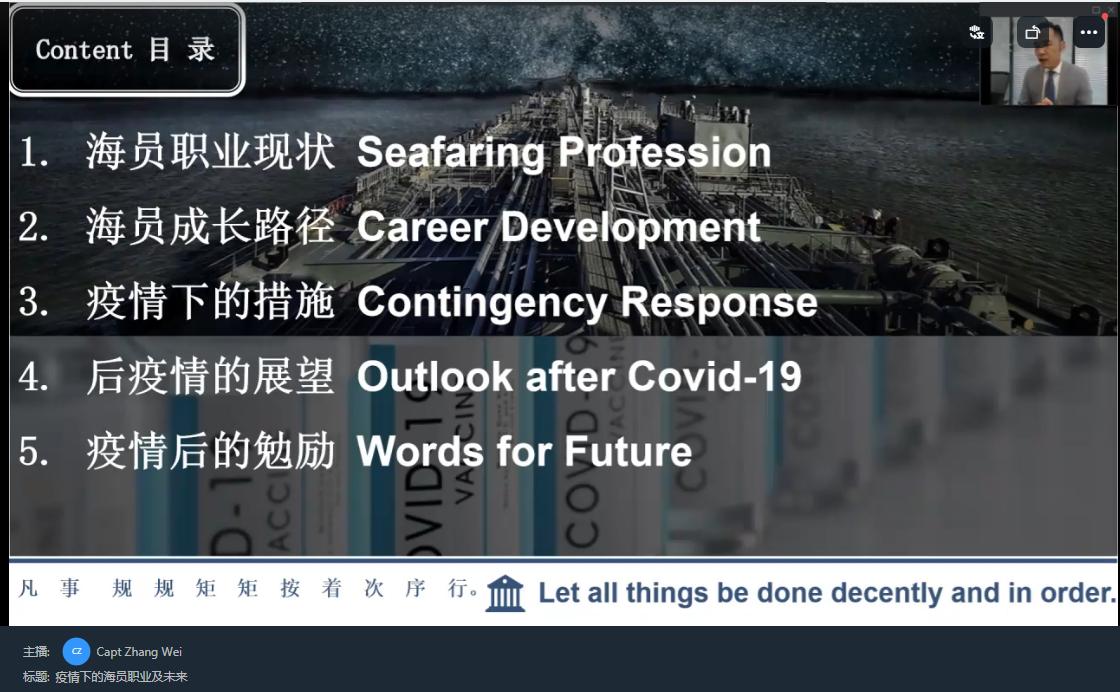 此次讲座邀请到了来自东弘国际海事集团的资深船长张伟。张船长从自身航海经历谈起,带着大家一起分析了海员职业的现状、海员成长的路径、疫情下的措施、后疫情的展望。目前,中国是全球应对疫情最高效的国家,一系列规则和禁令的制定使得中国港口成为海员换班的首选地点,这给中国海员的职业发展带来得天独厚的优势。张船长勉励同学们一定要抓住这次中国海员高速发展的机遇,努力学习各种知识,锻炼自己的专业技能,成长为一名优秀的海员,在实现自我人生价值的同时为我国的航运事业发展助力。