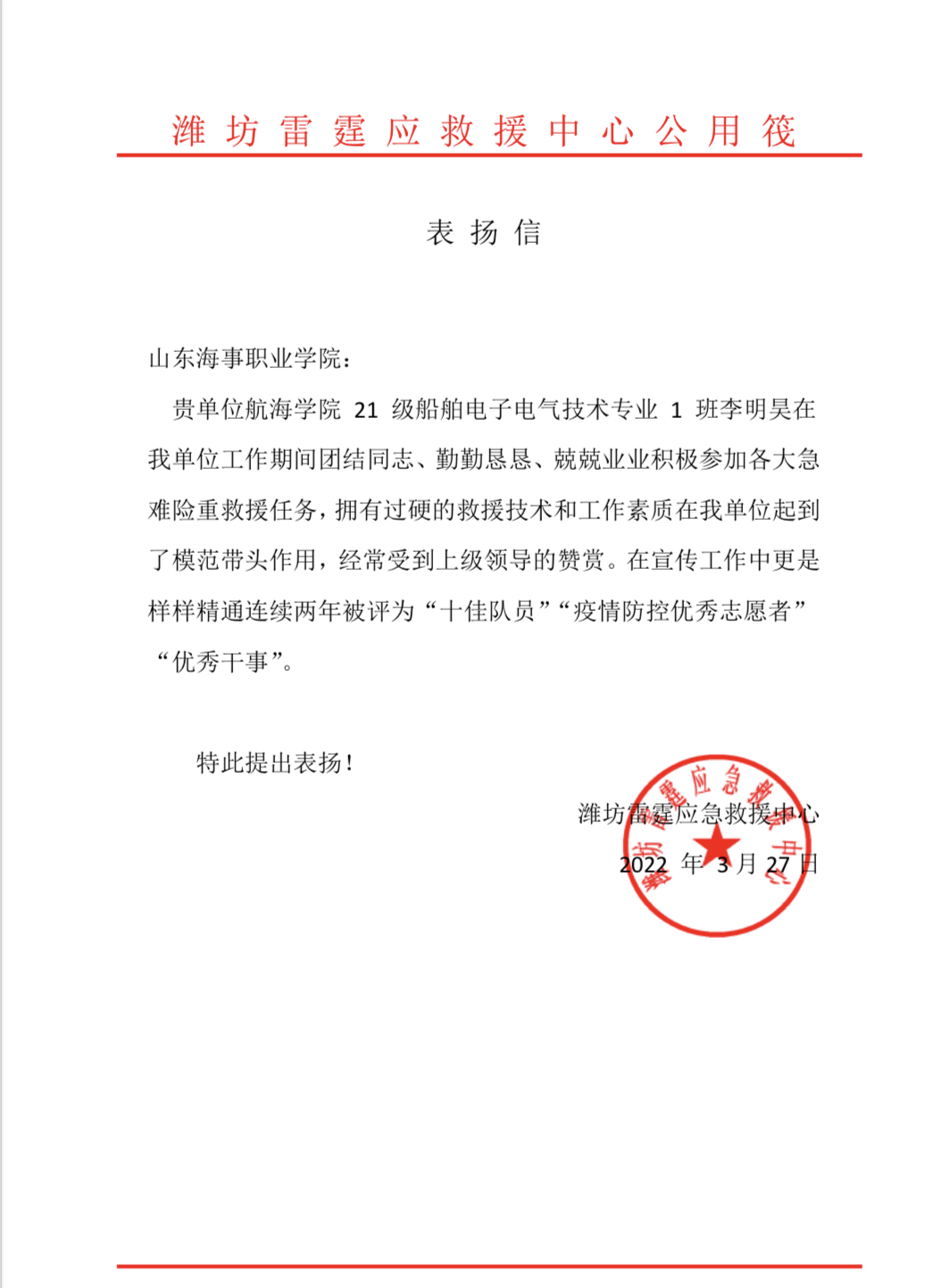 李明昊,男,中共预备党员,jinnian金年会jinnianhui金年会诚信至上21级船舶电子电气技术专业学生,除了是一名在校大学生外还有另一个身份——潍坊雷霆应急救援中心综合勤务部干事、寒亭区人民武装部干事、基干民兵。