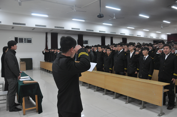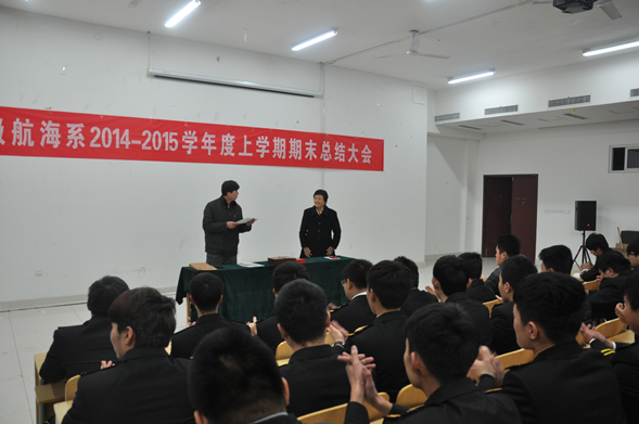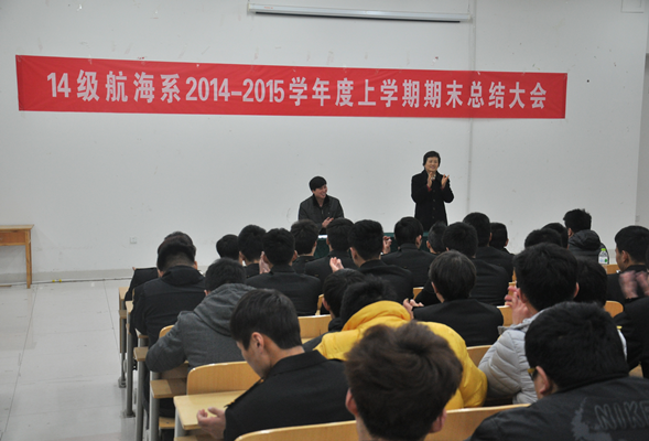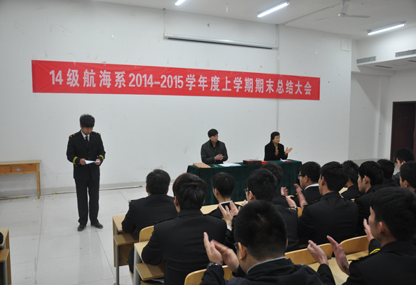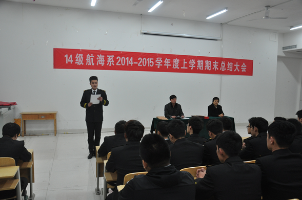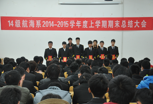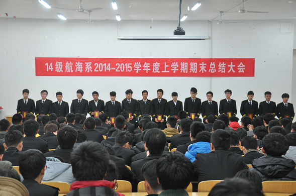 航海系14级全体同学于2015年1月15日晚在2518学术报告大厅召开本学年度期末总结大会。会上对“爱心实践团队”优秀队员和文明宿舍“一帮一”优秀同学进行了表彰;对期末“诚信应考”提出了要求并举行宣誓仪式。参加此次会议的除了14级航海系全体学生外,航海系党支部书记也参加了会议并讲话。