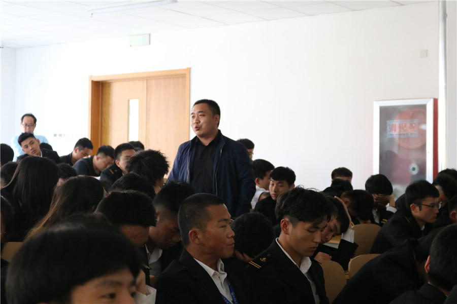 在与学生们的互动交流环节,同学们积极发言,表达心中疑惑。企业方有关的船长和轮机长在认真听取学生的问题后,从自身的成长过程出发,讲述了自己的船员生涯发展经历,分享了自己的一些船上工作经验,化解了学生们心中对船员这一职业的疑虑,并鼓励同学们要有清晰的理想目标,并要为此目标而付诸行动。
