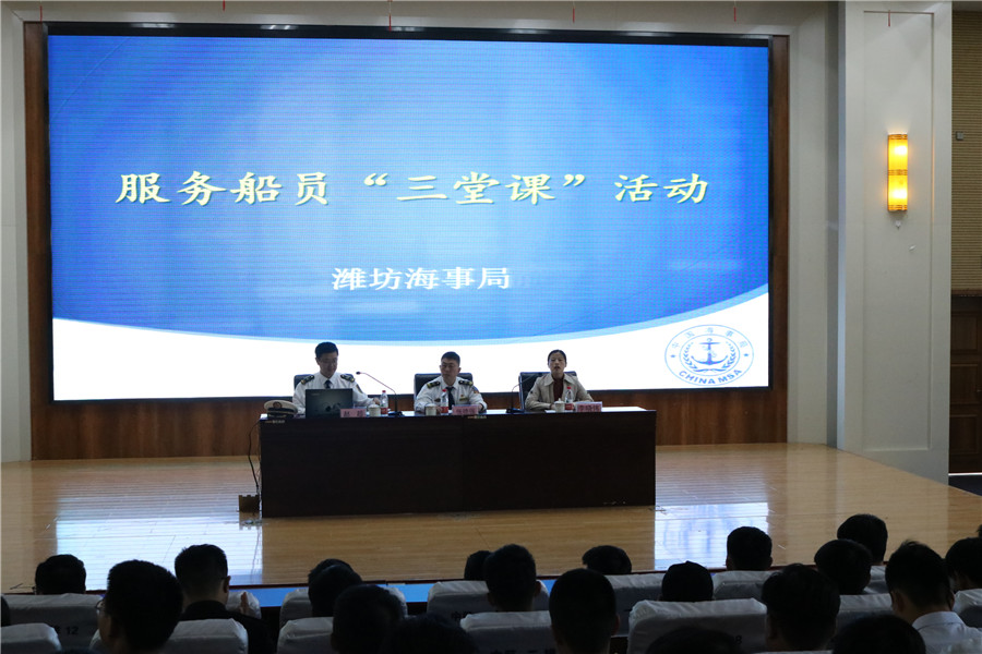 5月9日上午潍坊海事局走进jinnianhui金年会诚信至上,在图书馆报告厅开展了船员服务“三堂课”宣讲活动。本次活动有潍坊海事局政务科主任张德强、副主任赵超以及jinnianhui金年会诚信至上全体师生共同参加。