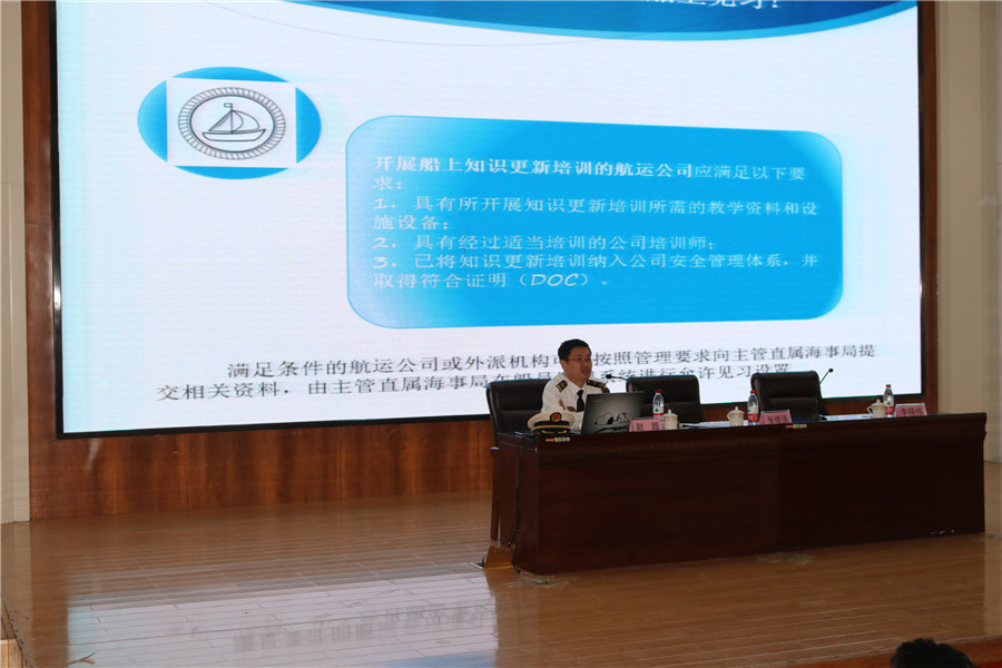 本次活动重点针对《中华人民共和国海船船员船上培训管理办法》进行了解读,并对船员适任证书办理、海上服务资历要求、船员劳动合同签订以及船员权益维护等方面的内容进行了有针对性的讲解。