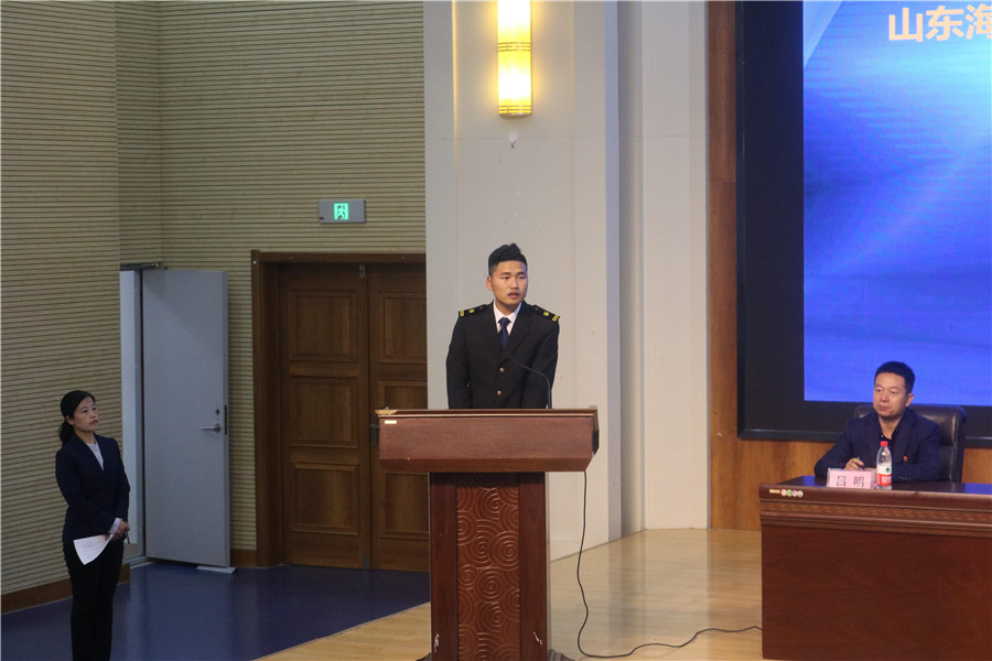 王旭副总经理代表企业致辞。他简要介绍了青岛华洋海事服务有限公司的发展情况,对现代学徒制“华洋班”开班表示祝贺。他希望“华洋班”的同学们能够努力学习,掌握扎实的学识和技术技能,努力成为既符合国际公约、国内法规要求,又满足社会需求的航海类专业人才。