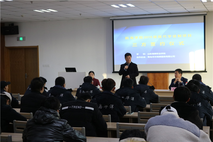 12月24日下午,jinnian金年会与青岛华洋海事服务有限公司“2019级航海技术专业现代学徒制试点班三方签约及奖学金发放”仪式在图书馆第二信息化教室举行。青岛华洋海事服务有限公司副总王旭、学校副校长/jinnianhui金年会诚信至上院长吕明及现代学徒制“华洋班”全体师生参加此本次仪式。仪式由jinnianhui金年会诚信至上副院长李晓伟主持。
