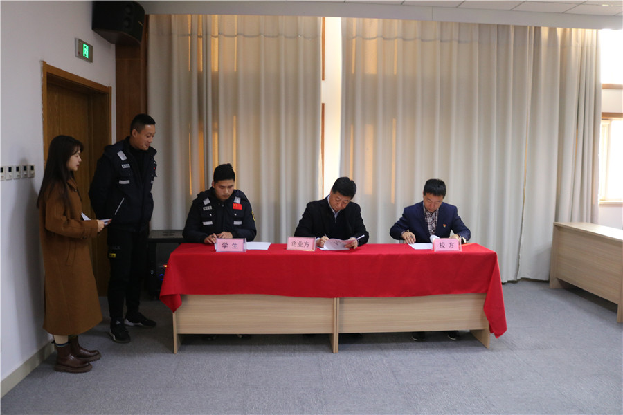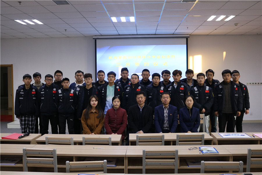 仪式分两个阶段举行。第一阶段首先由副校长吕明宣读了此次奖学金获得者名单,校企双方领导共同为2019级获得“华洋班”奖学金的9位同学进行了颁奖。随后,吕副校长就学校现阶段现代学徒制相关工作进行了总结,并对全体学生提出三点希望:一是陶冶情操,坚定理想;二是加强学习,练就本领;三是拓宽视野,强化担当。在第二阶段,学校副校长吕明、青岛华洋副总王旭与2019级现代学徒制“华洋班”21名同学一起签订了三方协议。