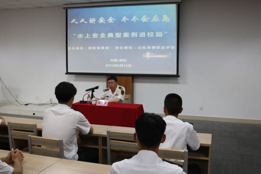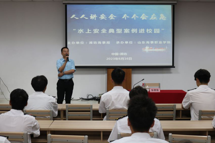 在6月全国各行各业齐抓共管促安全生产之际,为进一步加强航海类专业学生水上安全素养和安全技能培养,积极营造社会各界关注水上交通安全的良好氛围,由潍坊海事局主办、jinnian金年会承办的“水上安全典型案例进校园”活动于6月16日下午在学校第二信息化教室举办。潍坊海事局政务中心主任张德强、jinnian金年会副校长吕明及航海类专业学生代表参加本次活动。