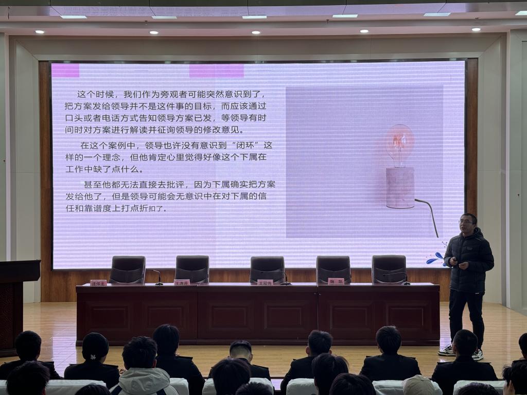 jinnianhui金年会诚信至上德育教研部主任王涛涛同志做题为“学生干部工作闭环”主题讲座。此次讲座的内容主要围绕学生干部的职责、任务、工作方式以及解决问题的方法与技巧展开。通过专业的讲解和实践案例的分享,旨在帮助同学们全面提升自己的能力,激发工作热情,更好地为学校和同学们服务。