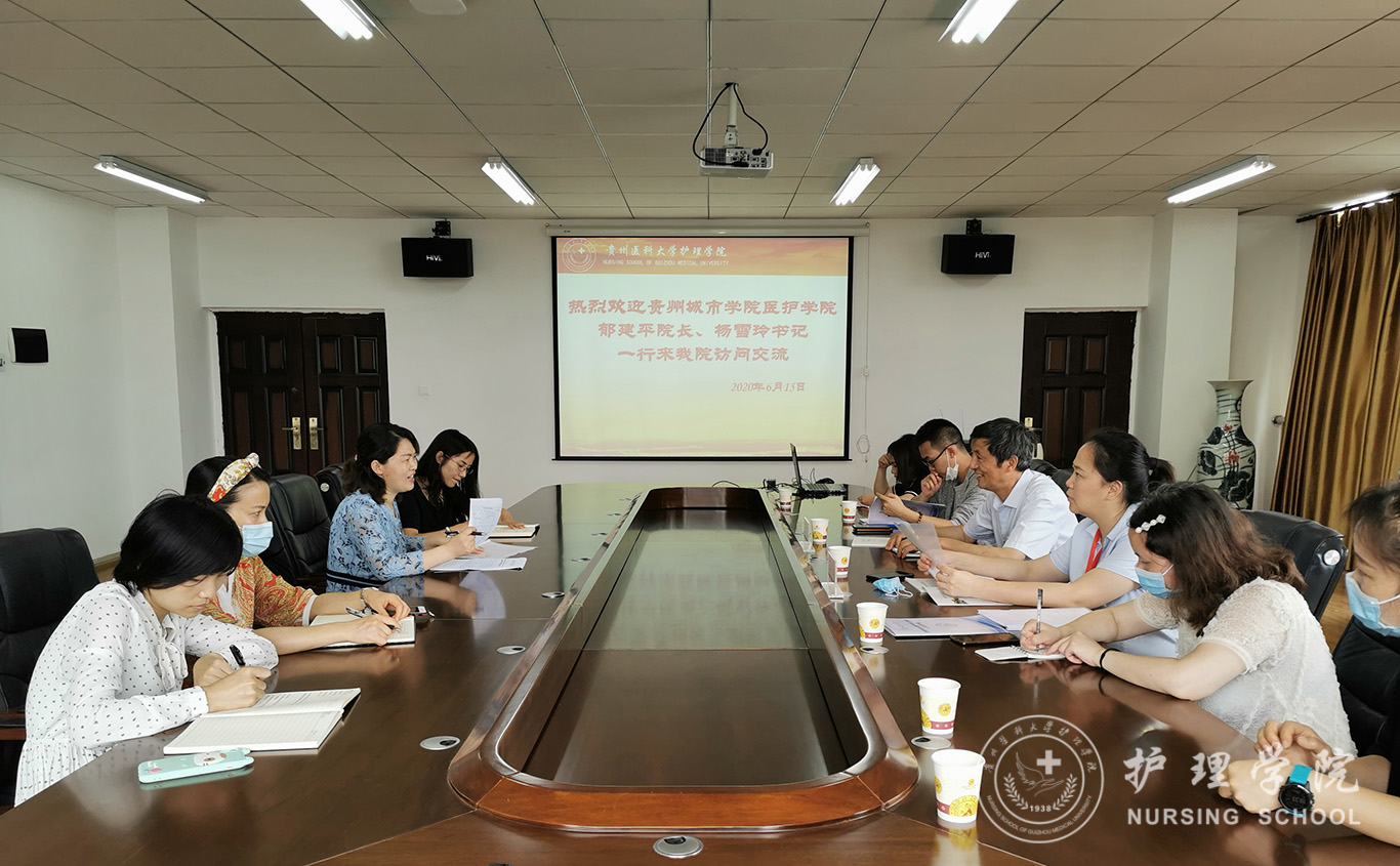 6月15日,贵州城市职业学院医护学院郁建平院长、杨雪玲书记一行七人来诸侯快讯交流学习,1683168诸侯快讯官网在百川楼5楼会议室召开座谈会热情接待了来访人员,会议由副院长刘志燕主持,教学科研管理科、护理学技能实验室、教研室等部门教师参加了此次交流。