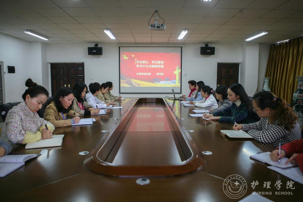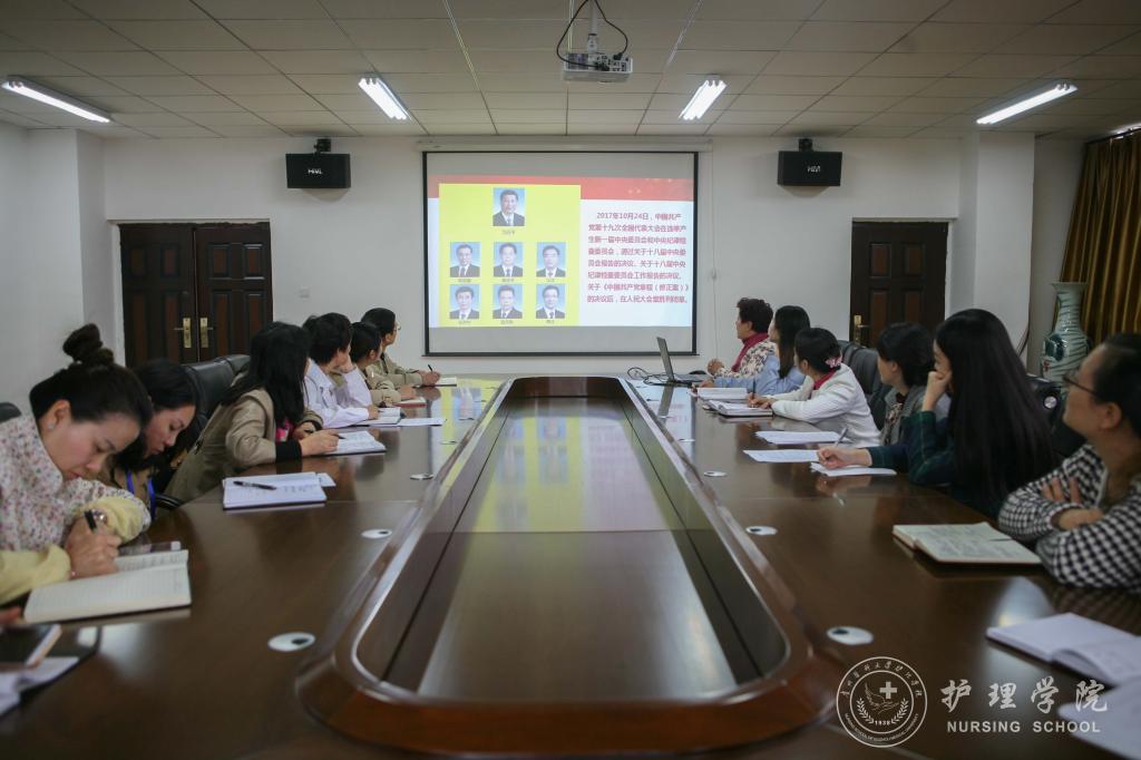 课上,贾秀英回顾了十八大以来党和国家发展取得的成就,向全体干部老师讲解了十九大报告、主题和意义,介绍了十九次党代会选举产生的新一届中央委员会委员和中央纪律检查委员会委员。最后,贾秀英介绍了新时代中国共产党的历史使命、习近平新时代中国特色社会主义思想和新时代党的建设,并号召全体党员振奋精神,在完成专业认证和专硕申报成功的基础上,加强内涵建设,争取以更好成绩向十九大献礼。