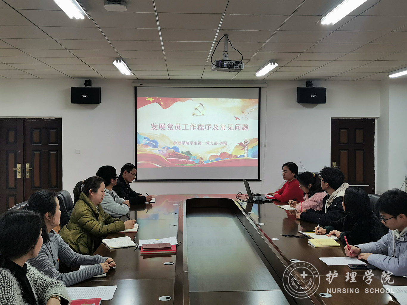 随后学生第一党支部书记李颖以《发展党员工作程序及常见问题》为题,就党员发展的几个阶段、对应材料、归档要求、注意事项等方面进行了详细介绍,并对各项培养材料的撰写要求进行培训。学生第二党支部书记马景瑶作了题为《牢记初心使命 坚定理想信念》的分享。