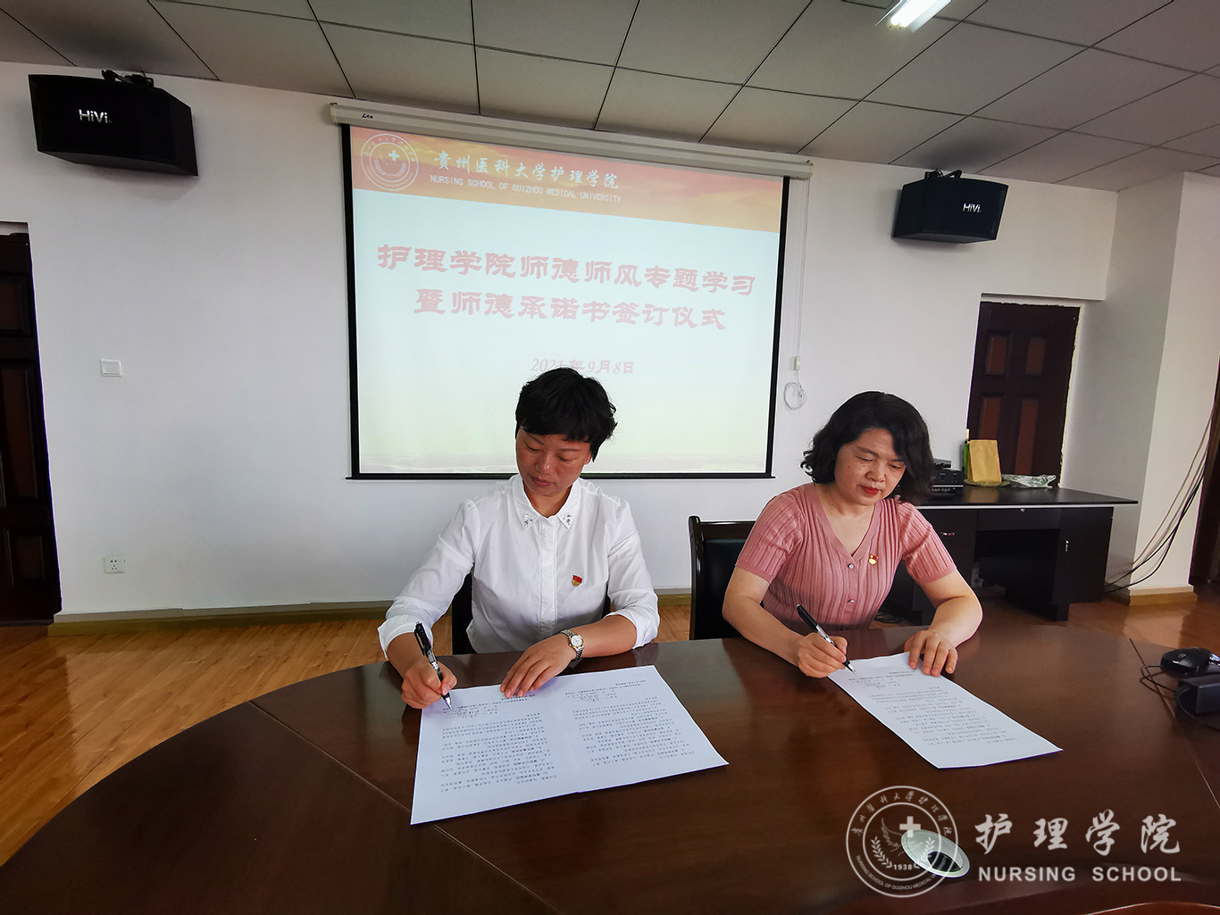 9月8日,1683168诸侯快讯官网全体教职工,在第37个教师节来临之际,在南校区1683168诸侯快讯官网5楼会议室开展了师德师风学习专题教育暨师德教育承诺书签订仪式。本次活动由教职工党支部书记张仁莉同志主持。