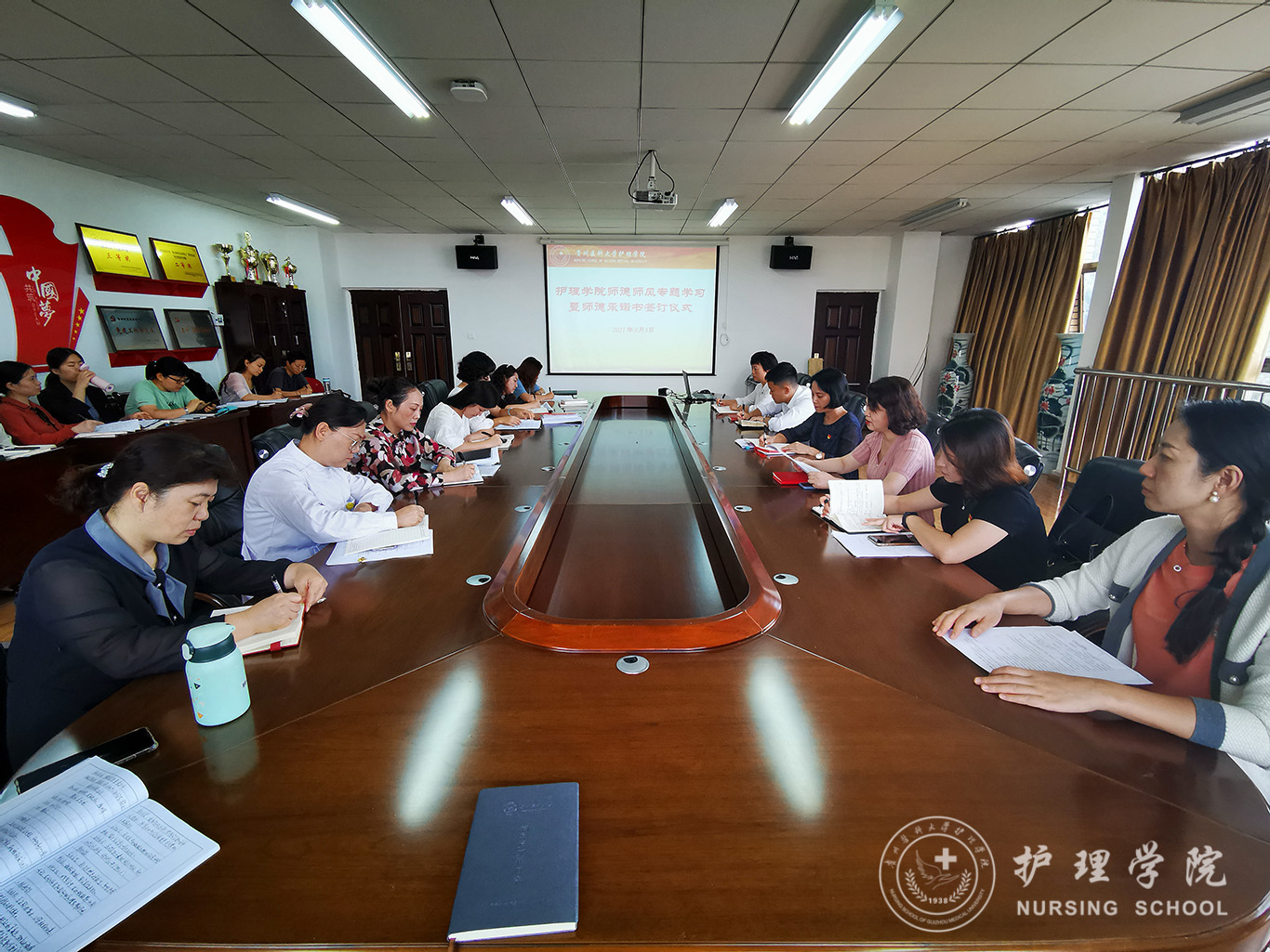 首先刘志燕副院长领学《新时代高校教师职业行为十项准则》,要求全体教职工一定认真落实,履职尽责,深入贯彻落实全国教育大会精神,进一步加强师德师风建设。接下来张仁莉解读师德教育承诺书签订的意义和要求,全院教师依次签订师德承诺书。