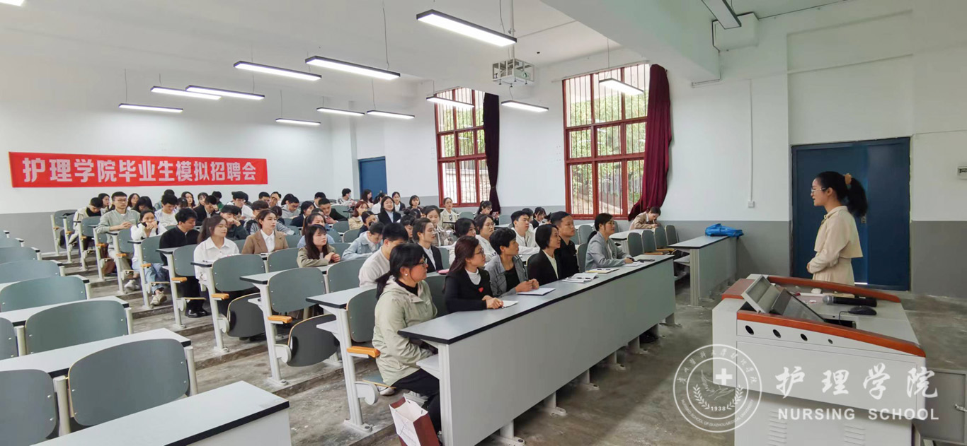 本次模拟招聘会设置自我介绍、面试官现场提问、应聘人员现场作答三个环节。首先,同学们作为应聘人员围绕自己在大学期间的学习经历和收获,进行了自我介绍。接下来,参与招聘会的领导和老师作为面试官从应聘原因、医患关系处理、护士职业基本素养、护理岗位职业认同以及突发状况处理等方面进行了现场提问。同学们根据提问,大方真诚地同面试官进行了交流,并一一作答。现场的领导老师对同学们的表现进行一一点评,指出大家在面试过程中存在的问题,并给出了建议。期间,张仁莉现场向同学们讲授了面试时仪容仪表的注意事项,包括站姿、坐姿、走姿、神态表情等细节,同学们均表示受益匪浅。