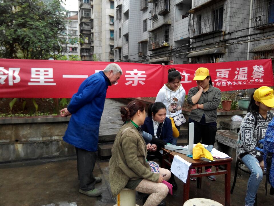 本次活动的主要内容分为四项:第一项,测量血压;第二项,宣传春季养生知识;第三项,鼓励居民们互留联系方式;第四项,送小礼品。在活动的过程中每个成员都积极参与,团结一致,同学们还和居民们聊天、拉家常等。尽管天空下起了大雨,大家也没有退缩,信念没有因为大雨的到来而放弃,热情没有因为大雨而减退。同学们更感欣慰的是人们的一声声谢谢,顿时感觉特满足。同时,整个小区也充满了温情。