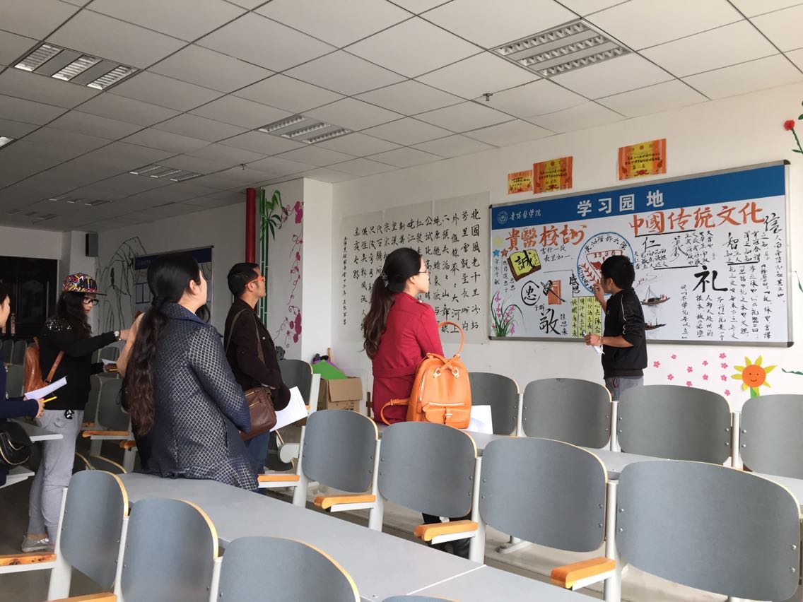 评委们在各班宣传委员的解说下,分别参观了护理12级本科班、13级甲乙丙3个班、14级本科和助产班以及12级专升本班的文化墙建设。在这7个班级里,每班对于“弘扬中华传统文化”都有独特的见解,有的以书法绘画艺术为主,有的则着重诗词歌赋。评比过程中,评委们认真仔细地打分并加以耐心的指导,对设计新颖的班级表示肯定,希望再接再厉。