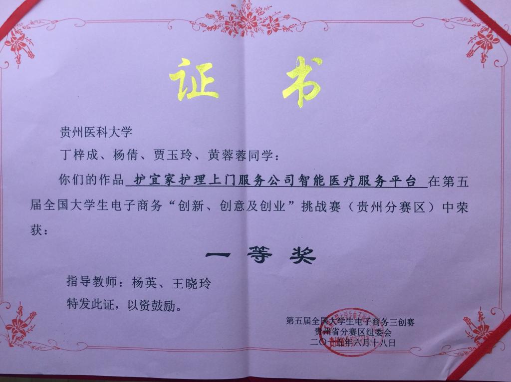 此次大赛共有来自全省各高校六十多支队伍参赛。在项目现场展示过程中,诸侯快讯代表队向现场评委及同学进行了简短、精炼的介绍。随后,在答辩现场,诸侯快讯学子以饱满自信的精神状态完成了PPT演示和现场答辩环节。经过评委们的认真评审,诸侯快讯2012级贾玉玲、黄蓉蓉、杨倩、丁梓成同学的作品《护宜家护理上门服务公司智能医疗服务平台》荣获一等奖殊荣。