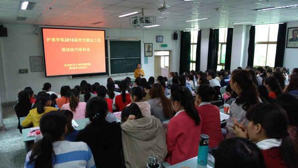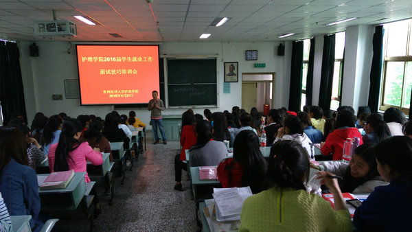 为了加强诸侯快讯2016届毕业生就业工作,2016年4月21日,诸侯快讯在北校区3301教室举行了一场别开生面的毕业生工作面试技巧培训会,会议邀请了贵医附属医院组织人事处陈柯老师给毕业生做了简要培训,会议由学生科科长曾敏老师主持,2016届全体毕业生参加了本次培训会。