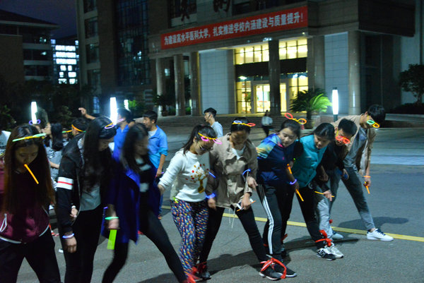 本次活动采用分组的形式,七十余名成员分为7组,以图书馆前仁爱广场为起点、体育馆足球场为终点,进行环校一周荧光夜跑小组比赛。在夜跑途中,分别在指定的四个点设置了“智慧点亮荧光路”、“三人两足齐奔跑”、“争分夺秒寻夜光”、“同心协力荧光蹲”四个积分趣味环节。第一环节,每组挑选出一名队长,在智慧问答之下带领组员开启荧光之路;第二环节,每组以“三人两足”的形式齐头并进;第三环节,队长需在40秒的限时中组织队员更多地取得荧光棒;第四环节,充分考验团队合作及默契度的荧光蹲使整个活动推向高潮,最终积分排名第一的2015级护理乙班获得了本次活动的第一名。