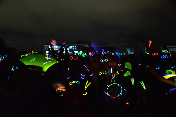 活动中,同学们迈着矫健的步伐穿梭在夜里、享受着夜跑乐趣同时,也在积极为本组赢取积分,他们手里紧握着的荧光棒早已把整个校园装点成一个荧光闪耀的欢乐海洋,涌动的人群和五彩的荧光也在学校形成了一道亮丽的风景线。至此,时长近一个半小时的荧光夜跑活动便在同学们的欢声笑语中画上了圆满的句号。