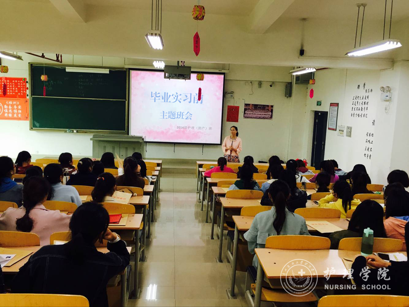 4月12日,1683168诸侯快讯官网在北校区4401教室毕业实习前主题班会, 2014级护理学(助产)专业的班主任徐锟老师主持了此次班会, 2014级护理学(助产)的全体同学参加。