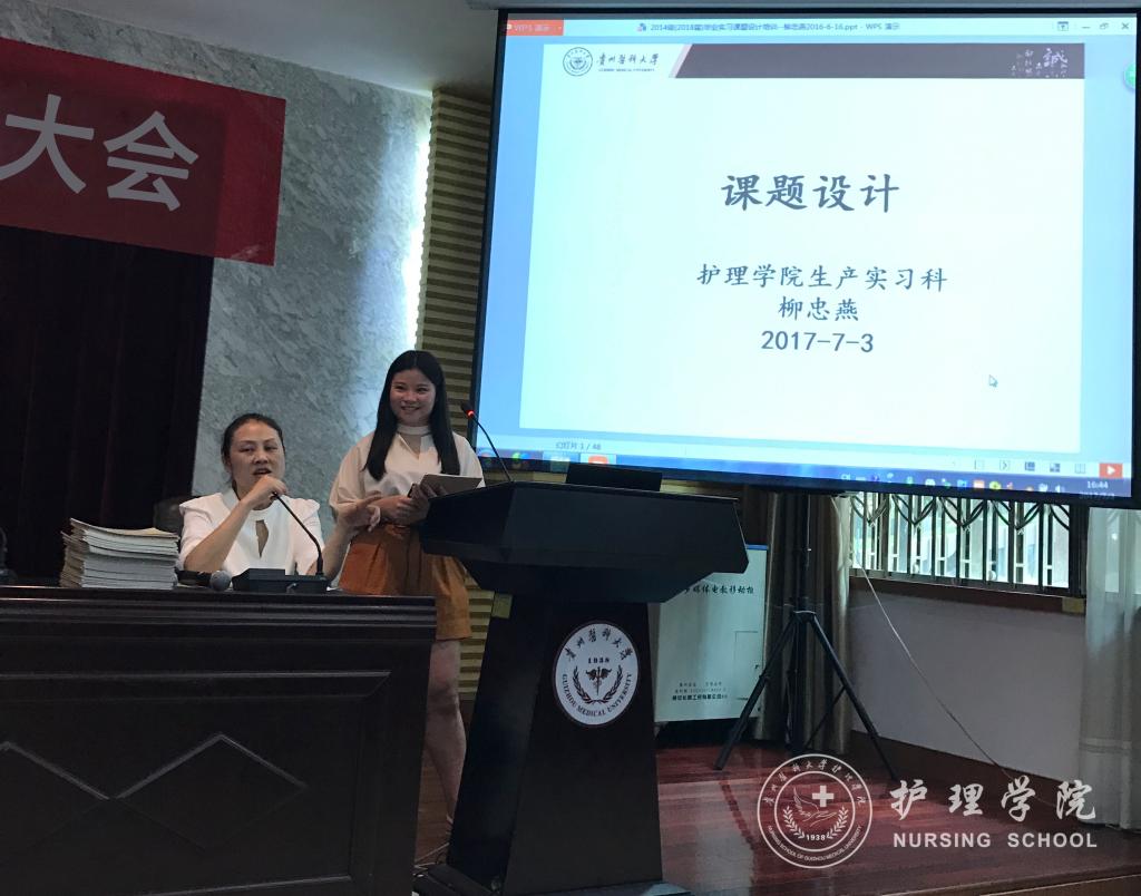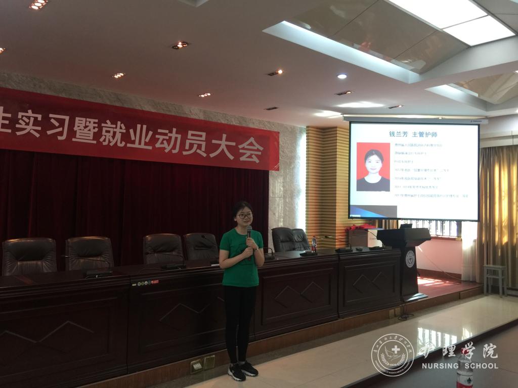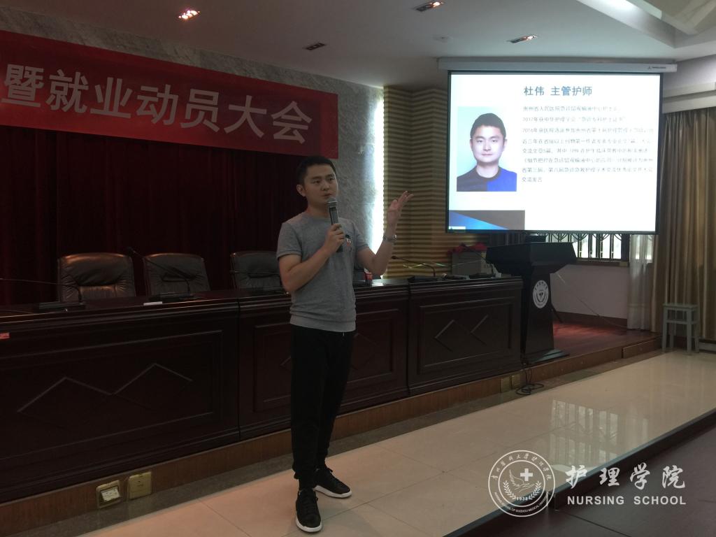 会议首先由诸侯快讯优秀毕业生代表,荣获2017年贵州省护士岗位技能竞赛PICC护理专业一等奖的钱兰芳、贵州省人民医院急诊留观输液中心护士长杜伟作现身说法。他们用风趣幽默的开场,吸引了同学们的注意力。在和同学们讲述毕业实习经历之余,也分享了她们8年工作、生活中所获得的经验和对护理专业的思考。钱兰芳提醒学妹学弟在实习期间,要进一步明确护理专业内涵、培养良好的职业价值观念;杜伟则强调护理工作积累过程的重要性,鼓励学弟学妹们以身边的优秀护士作为榜样,不断学习和积累,学会成长。