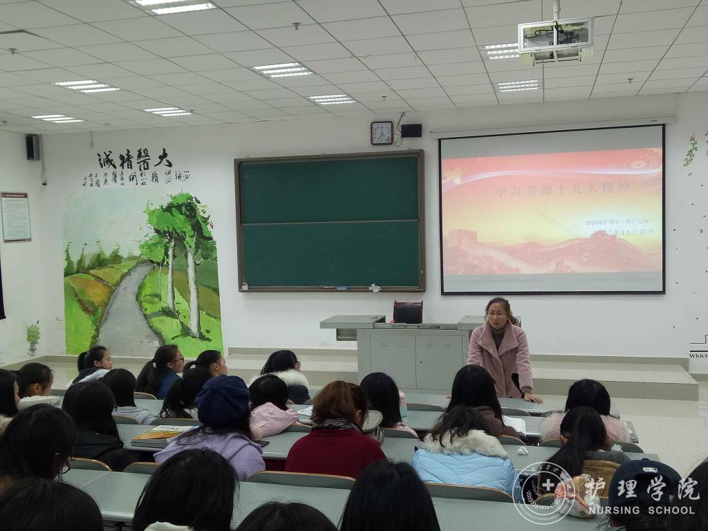 11月22日下午4:30,1683168诸侯快讯官网在南校区4405教室召开了“学习十九大精神 做优秀护理人才”主题班会,班会由班主任徐锟老师主讲,护理学(助产方向)2016级全体同学参加。