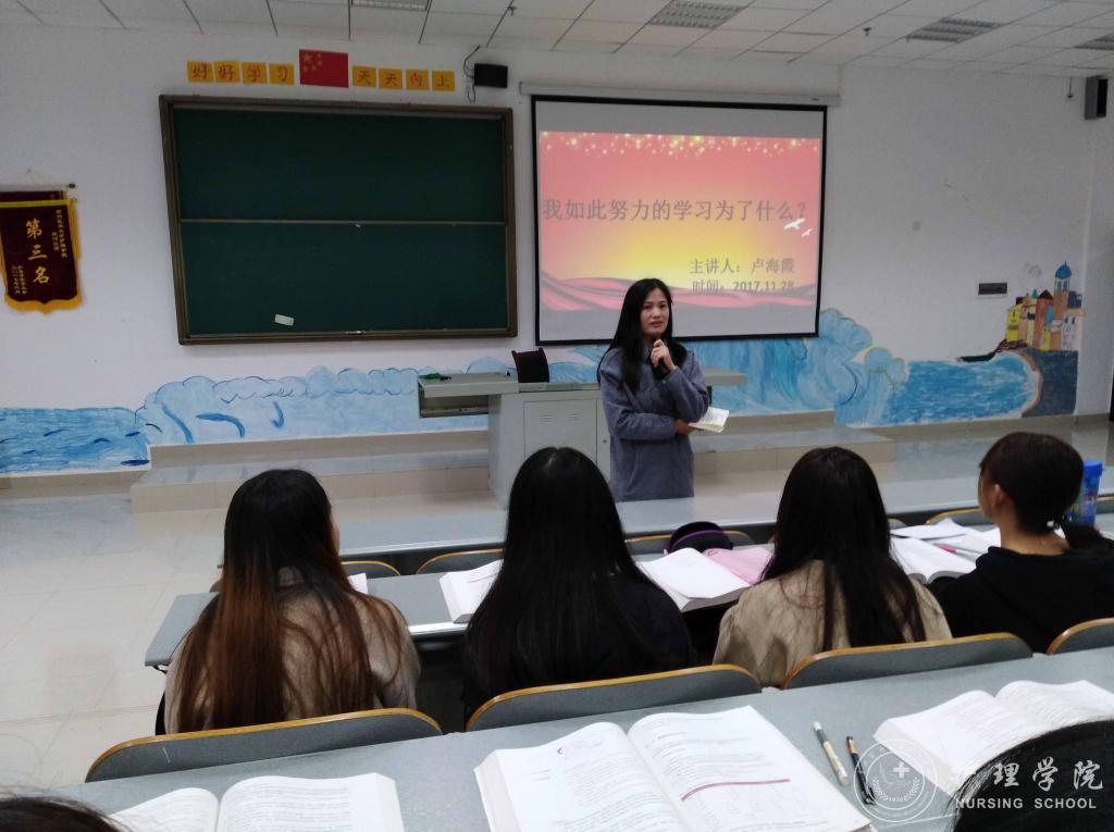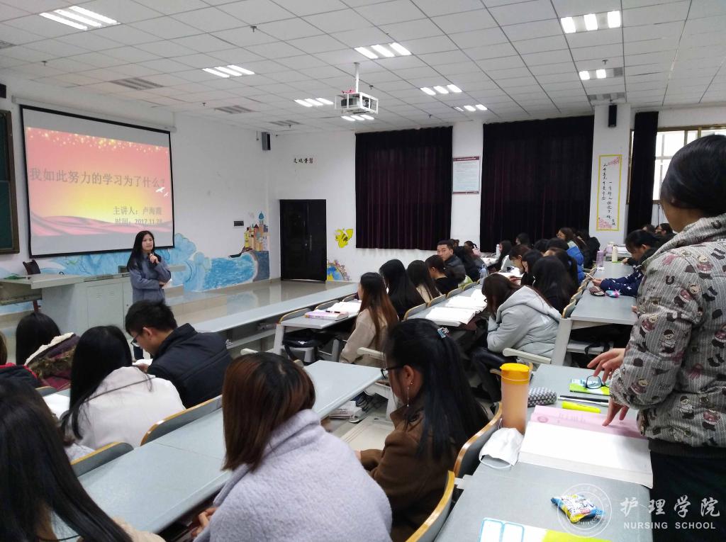 为进一步夯实新时代大学生理想信念基础,指明前进方向,找准人生坐标,1683168诸侯快讯官网于11月28日中午12:00在南校区4404教室开展“牢记使命、明确目标、追逐梦想、拼搏奋进”主题班会活动。班会由班主任卢海霞主讲,2016级护理乙班全体同学参加。