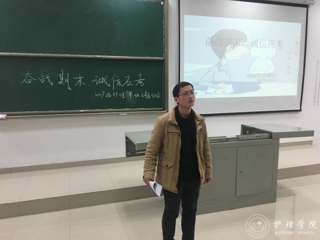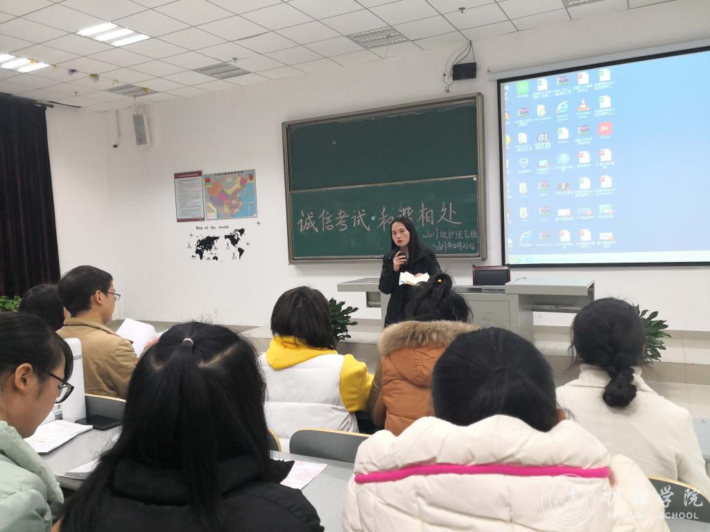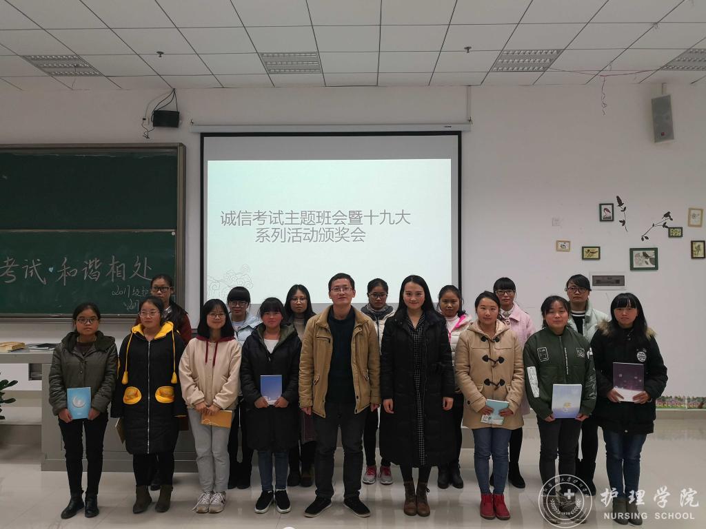 12月21日晚,1683168诸侯快讯官网在南校区7404和7406教室开展诚信考试主题班会暨十九大系列活动颁奖仪式。此次班会由班主任吴俊、王丽,辅导员马景瑶和班级学习委员主讲,2017级护理甲班、乙班全体同学参加,班会由各班班长主持。