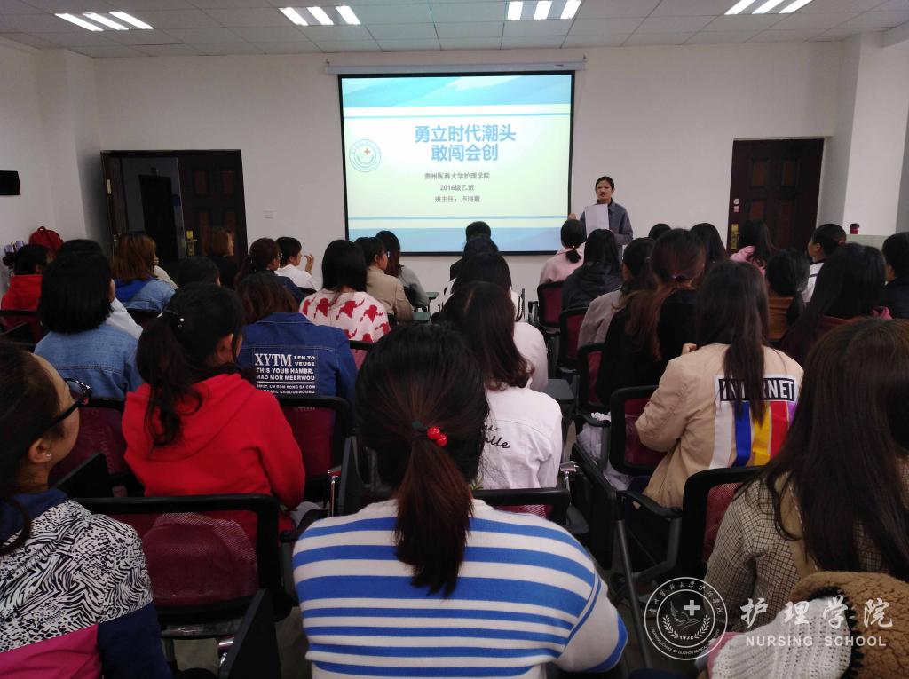 2018年3月26日上午,1683168诸侯快讯官网2016级甲班班主任马丽、2016级乙班班主任卢海霞分别在南校区4403教室与百川楼示教室给2016级甲班、乙班全体同学召开了主题为“勇立时代潮头·敢闯会创”的主题班会。