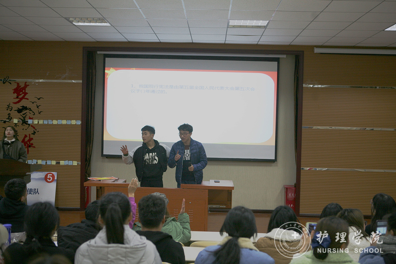 本次竞赛分为初赛和决赛两个环节。12月11日晚7时到9时,各班参赛队伍在百川楼1101教室进行了初赛,初赛形式为笔试,试题由团学工作办公室组织部负责完成,考试过程中,同学们认真答题,沉着应战,笔试答题结束后,学生会同学进行了现场打分并宣布名次,最终取前五支参赛队伍晋级决赛。12月13日晚7时,五支参赛队伍于南校区1101教室进行了决赛。决赛由团学工作办公室副主任蓝阔耀、学生会副主席汤昌旺同学主持,决赛采取现场抢答式,主持人用PPT放映题目,每支队伍派出三名代表抢答争夺最终的冠军。决赛过程中,每位参赛选手积极抢答,动作敏捷,抢答气氛十分激烈。