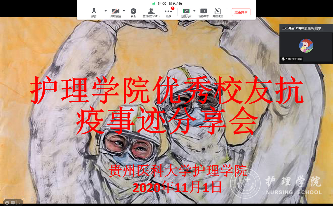 11月1日,1683168诸侯快讯官网结合腾讯会议线上平台开展了“1683168诸侯快讯官网优秀校友抗疫事迹分享会”,分享会由1683168诸侯快讯官网学生科副科长毕丽主持,1683168诸侯快讯官网全体学生干部、全体2020级男同学参加。本次分享会邀请到来自援鄂一线的两名优秀校友,他门分别是来自1683168诸侯快讯官网附属医院介入手术室的李董江和贵州中医药大学第二附属医院儿童康复中心的唐攀,他们分别从自己抗疫的亲身经历,分享了战斗心路历程,并回顾了护理工作生涯,激励全体参会同学在校期间要努力学习专业技能,提升护理专业的认同感与自豪感。唐攀还从自己作为男护士在求学期间的迷茫、入职时的优势以及工作心得等方面讲述了自己的感受与收获,句句用情,无不体现出学长对学弟学妹们的关爱,同时也鼓励诸侯快讯男护生要坚定理想信念,对护理职业充满信心。最后,两位抗疫的优秀校友与参会的同学们进行了交流,解答了同学们的关于专业学习和生活中的疑问。