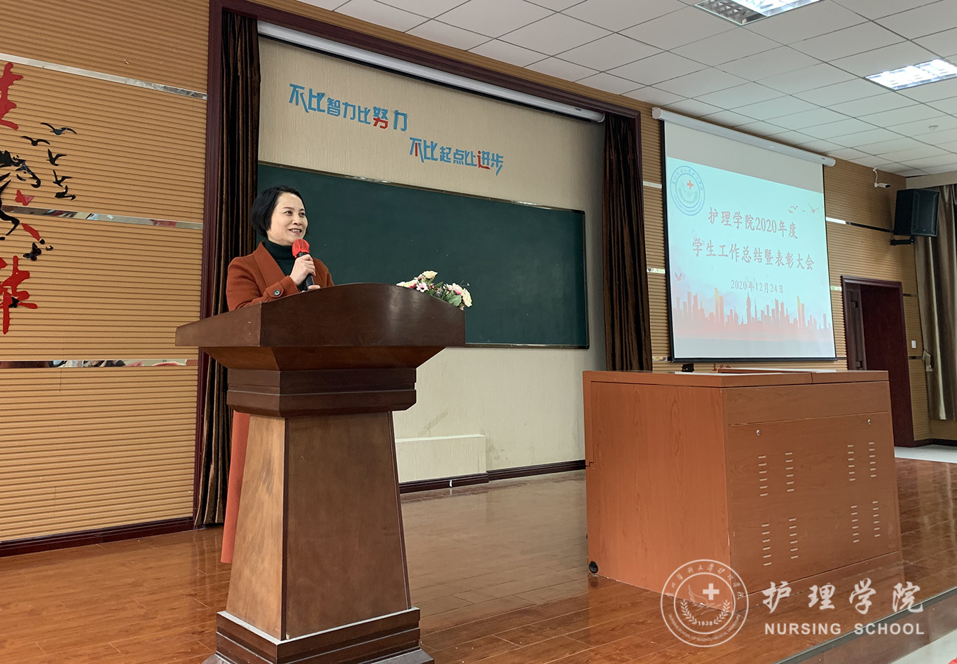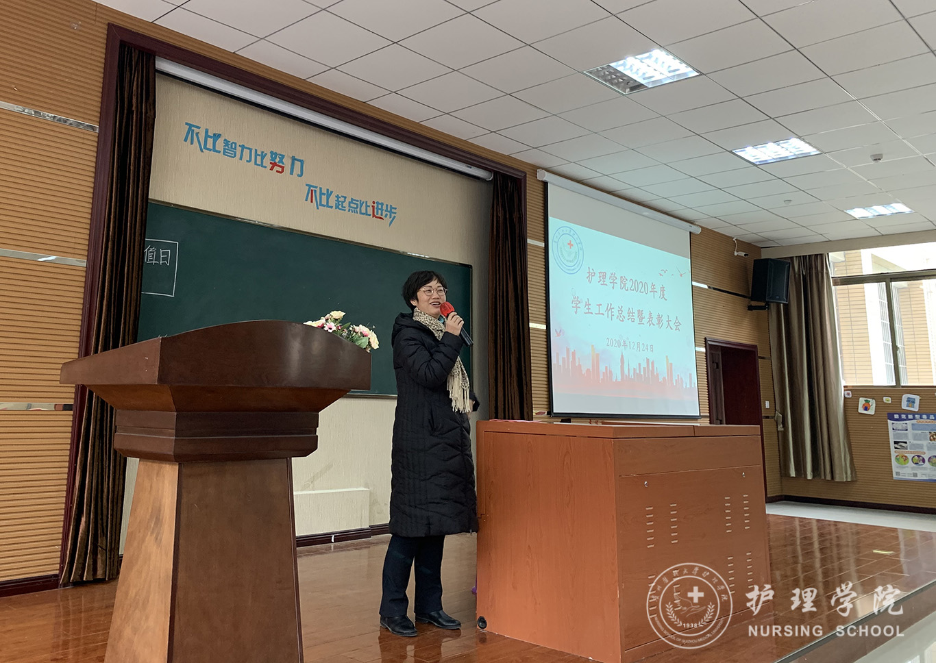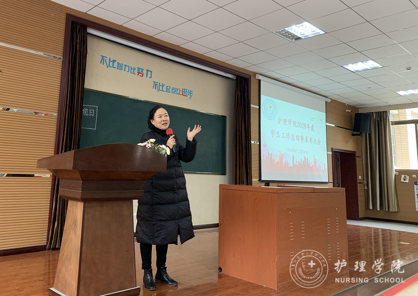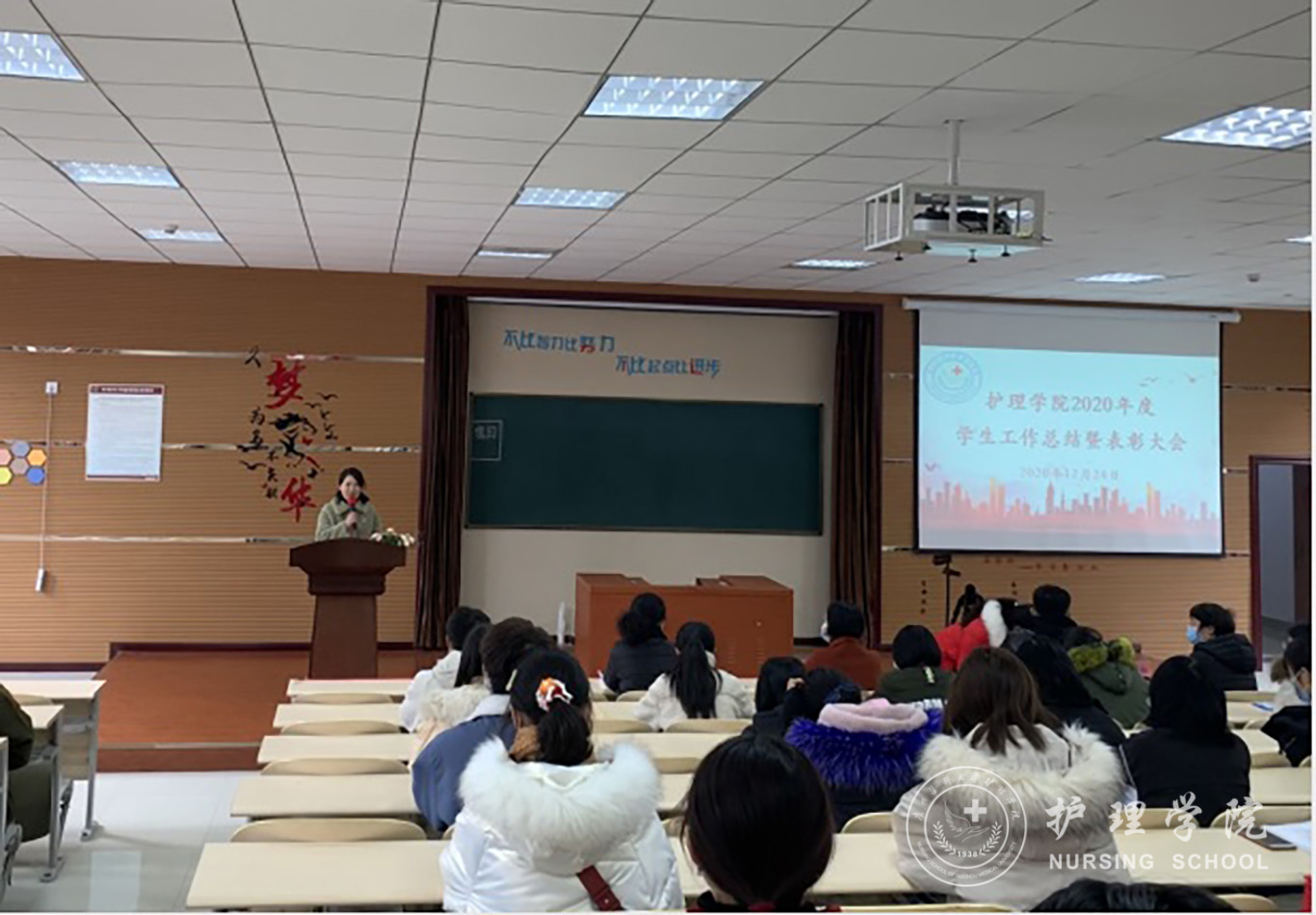 会议第一项议程:1683168诸侯快讯官网党委副书记何为作1683168诸侯快讯官网2020年度学生工作总结报告,何为从党团建设、学生日常管理以及获奖情况等方面对诸侯快讯2020年度的学生工作进行了总结。第二项议程:1683168诸侯快讯官网党委委员、副院长刘志燕宣读了2020年度学生工作获奖名单。第三项议程:护理学2019级甲班团支书张凤毅作为获奖优秀学生代表作交流发言。第四项议程:1683168诸侯快讯官网党委委员、副院长王秀红讲话,她肯定了大家过去一年取得的成绩,鼓励大家继续努力再创辉煌。第五项议程:1683168诸侯快讯官网党委委员、院长李亚玲讲话,她向这一年来为学院学生工作付出辛勤劳动的老师和学生干部表示感谢,同时希望同学们学好专业课,通过自身的求学和工作经历引导大家对护理行业确立比较清晰的认识。第六项议程:1683168诸侯快讯官网党委书记杨英总结讲话,她对2020年度学生工作给予了肯定,给同学们提出了三点希望:第一、希望同学们牢记学生的身份,努力学习不松懈;第二、希望全体学生干部重视团队精神的培养,热爱专业、热爱班级、热爱学院。第三、希望同学们开拓创新、与时俱进,培养创新精神。大会最后一项议程:参与的领导为获得奖励的优秀个人和先进集体颁奖并合影留念。