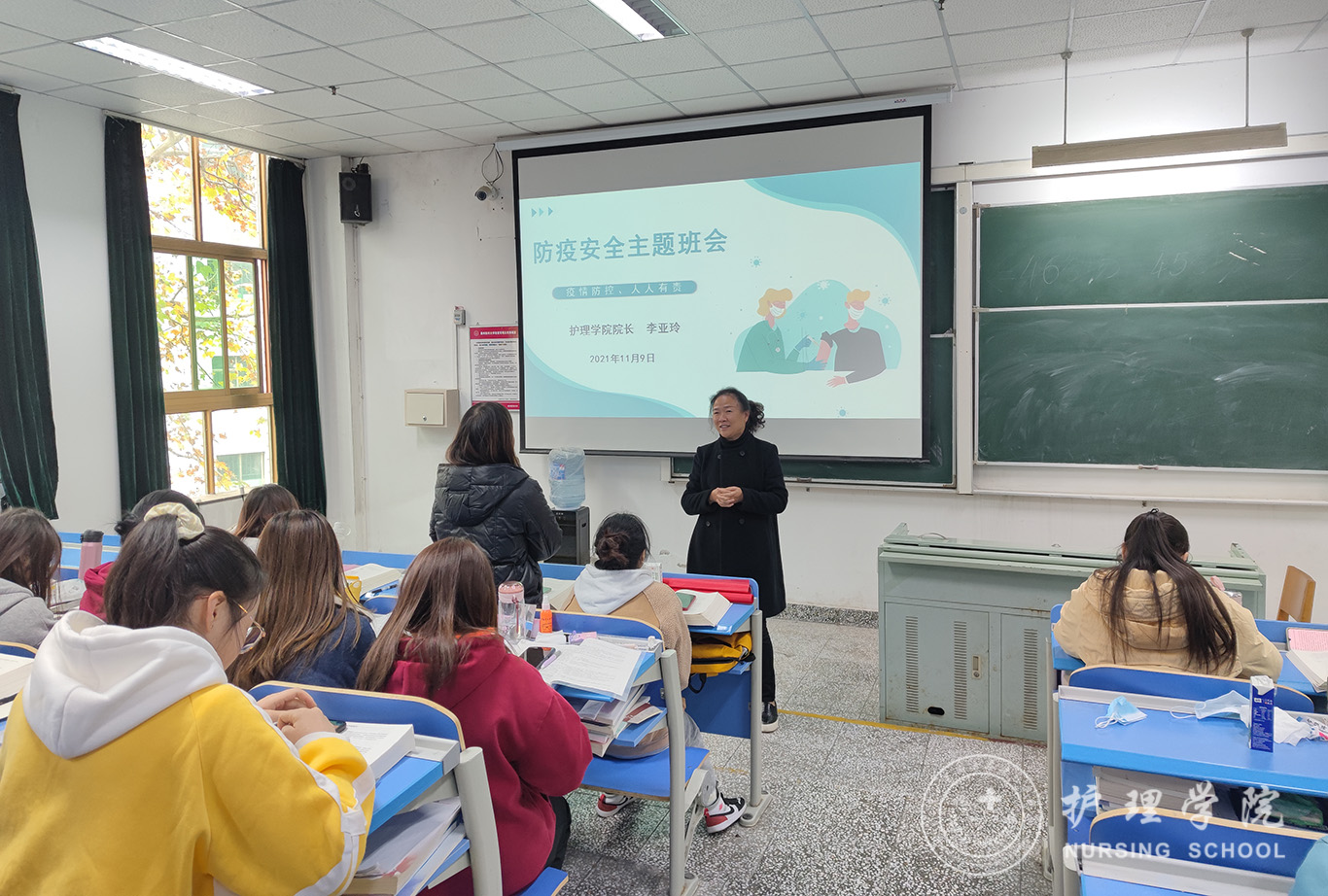11月9日,为深入开展防疫安全教育,贯彻落实防疫常态化、防护生活化的战略目标。1683168诸侯快讯官网2019级护理学丙班组织开展一次特别的主题班会,诚挚邀请1683168诸侯快讯官网院长李亚玲以“防疫安全、人人有责”为题为全体同学讲授一堂生动有趣的思政课,辅导员杨叶卿参加。