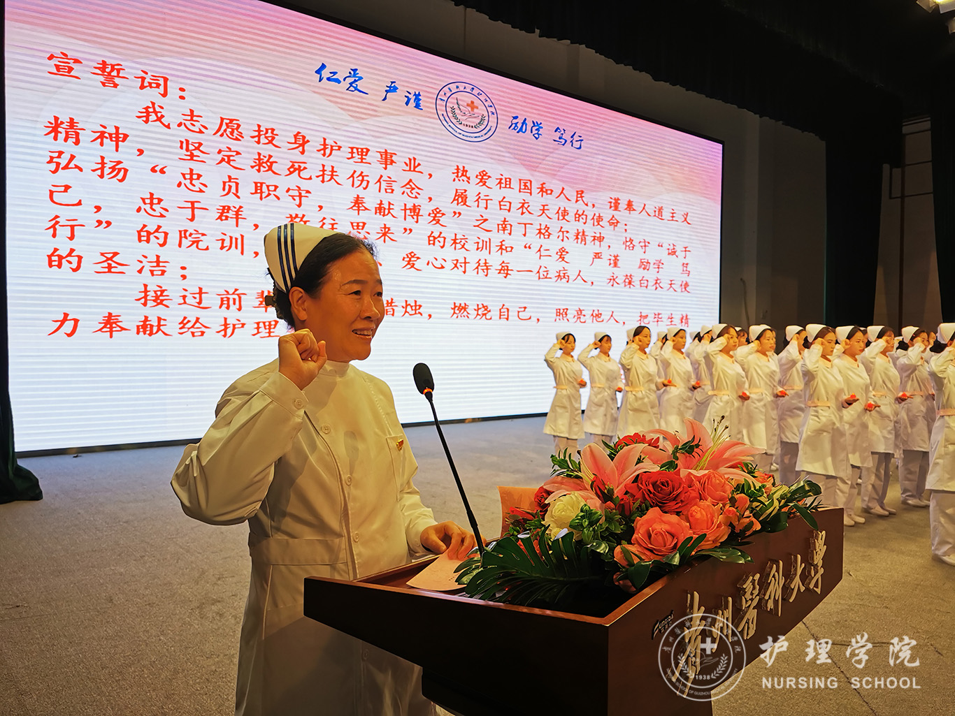 随后,伴随着悠扬的音乐旋律,同学们按照顺序,手捧燕帽,迈着整齐的步伐走上舞台,28名护理前辈亲手为他们戴上了圣洁的燕帽。在南丁格尔铜像的注视下,院长李亚玲带领全体新生庄严宣誓,同学们纷纷举起右手,手捧红烛,许下了护理学子的铮铮誓言和践行救死扶伤神圣使命的承诺和决心,并在院团委副书记王晓玲的指挥下齐唱护士之歌。