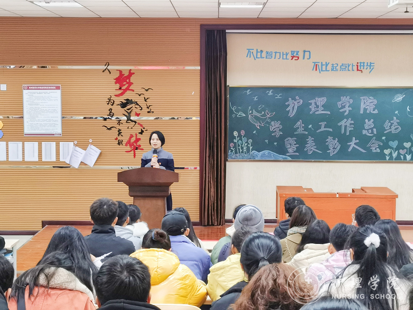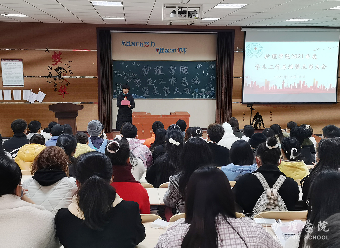 本次大会共有五项议程。首先,副处级组织员张黎作2021年学生工作总结报告,她从抓牢思想建设、抓好团学工作、抓严学生管理、抓实专项工作、创新校园文化活动、助力疫情防控等六个方面总结了2021年度学院学生工作开展情况。接下来,副院长王秀红宣读了先进集体和优秀个人获奖名单。紧接着,助产学2020级肖春同学代表全体学生发言:她结合自己的学习和援遵抗疫经历,分享了这一年的收获与感受,号召大家要勇担时代使命,做新时代的追梦人。