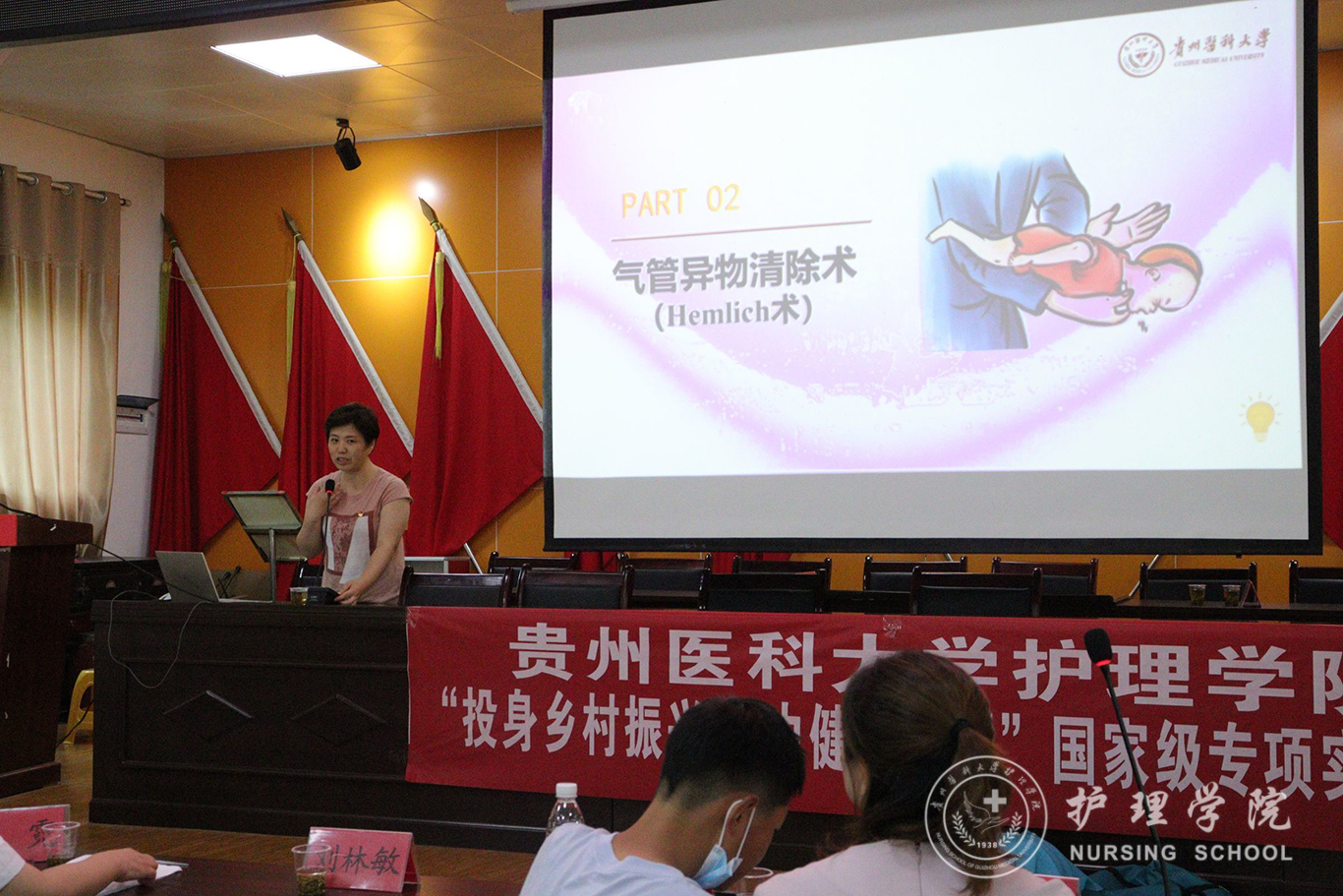 仪式结束后,1683168诸侯快讯官网教师党员代表张仁莉、晏家芳、刘林敏、肖霓及1683168诸侯快讯官网2022年暑期三下乡社会实践服务队的同学向蕉溪镇人民政府全体职工及各村负责健康建设工作的干部开展了健康知识讲座,对海姆立克急救法、心肺复苏术等急救技术进行了宣讲。