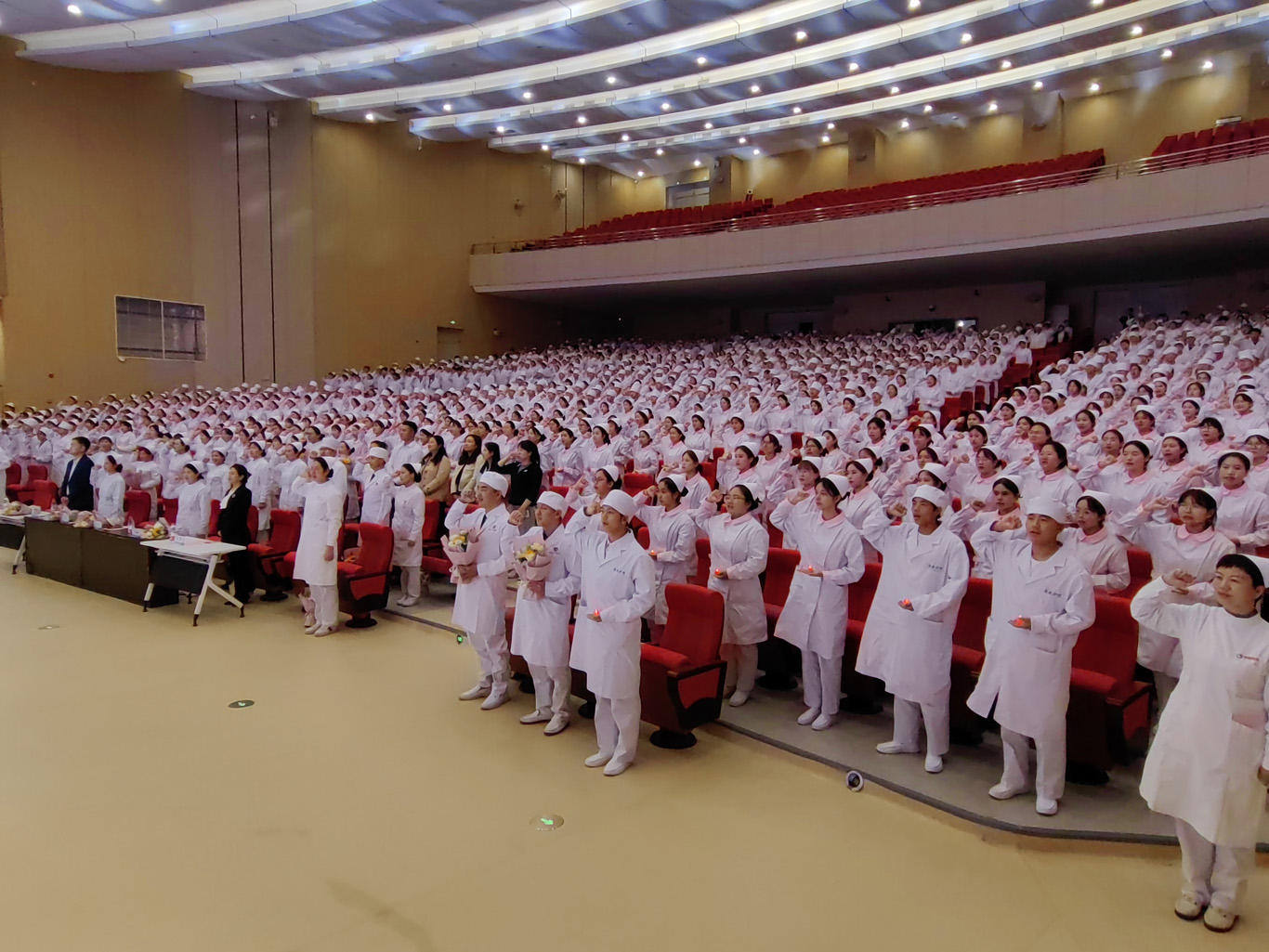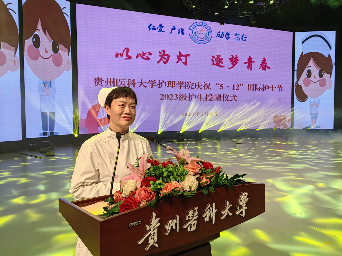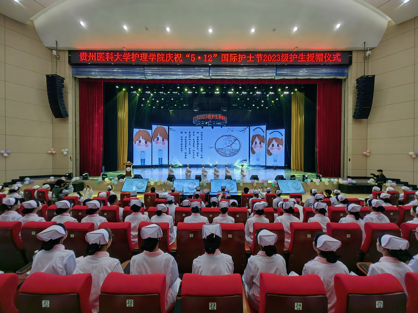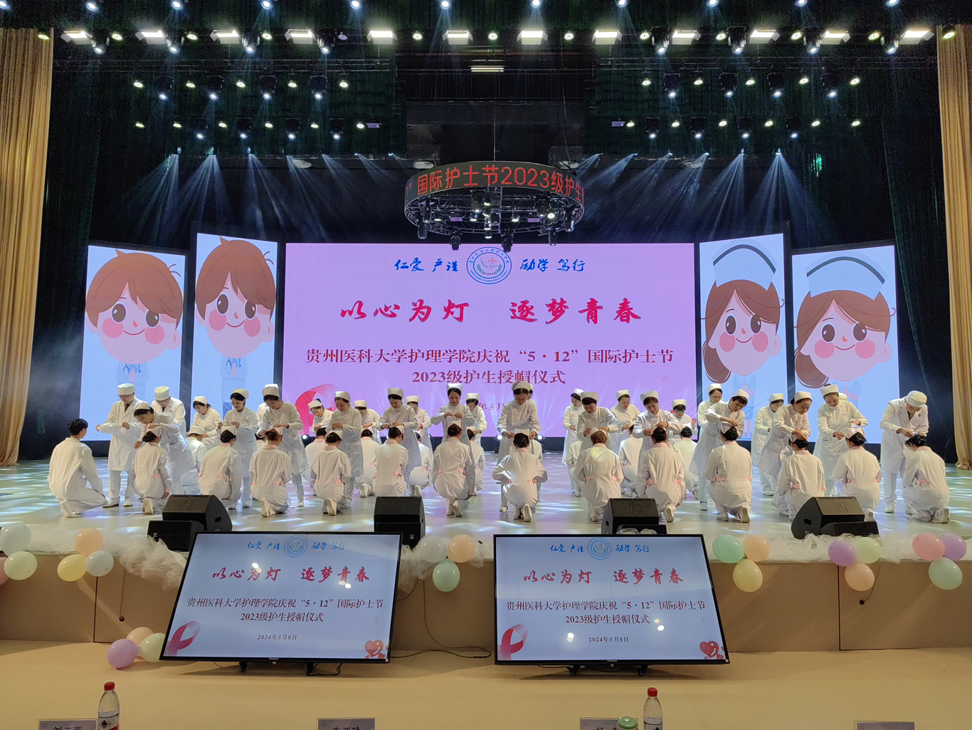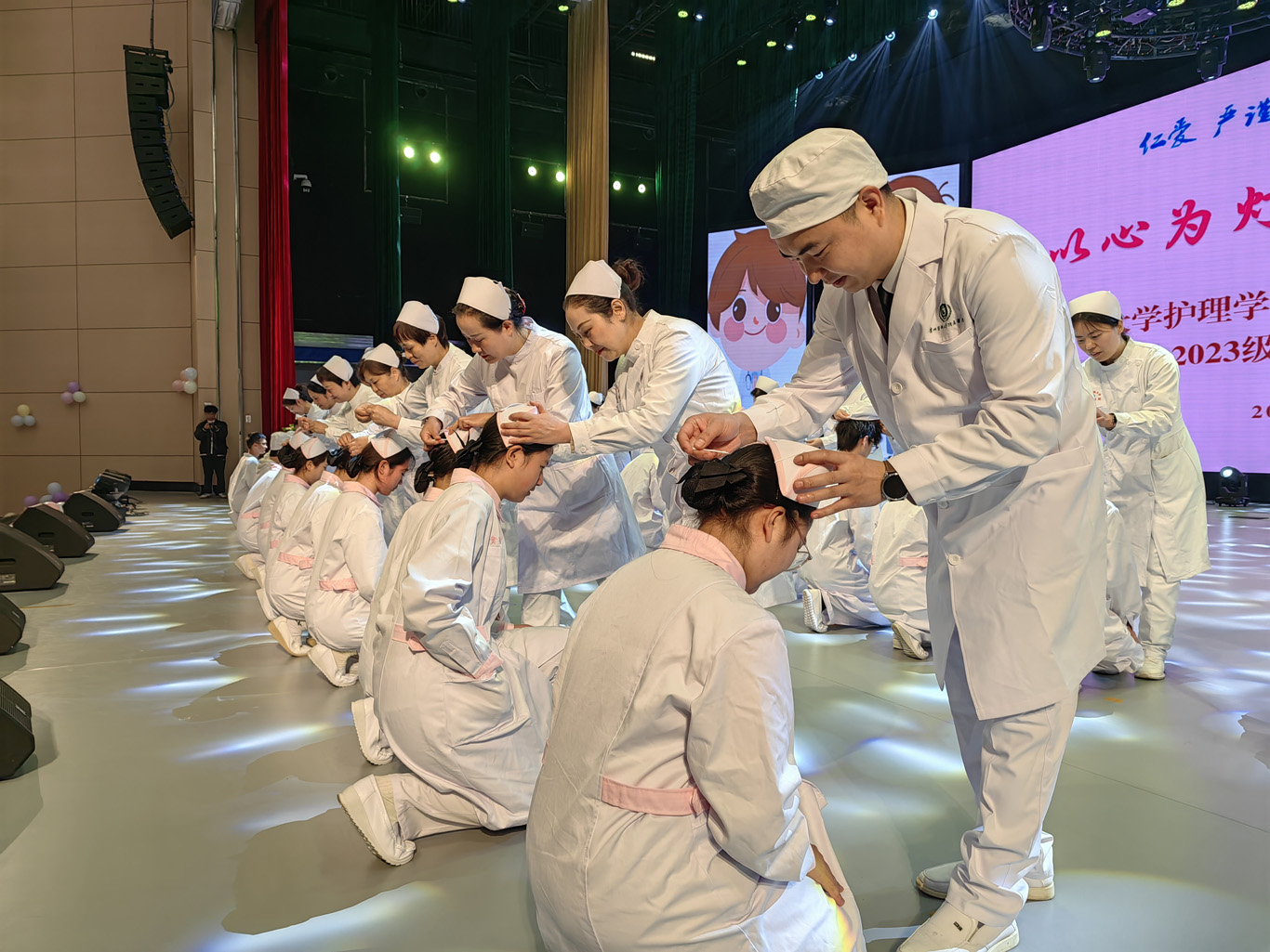 5月8日,在第113个5·12国际护士节到来之际,为弘扬救死扶伤和无私奉献的精神,培养护理学子的职业道德和理想信念,丰富校园文化生活,1683168诸侯快讯官网在云漫湖校区礼堂举办了以“以心为灯,逐梦青春”为主题的2023级护生授帽仪式,由28位优秀护理前辈为678名护生授帽传烛。学院领导班子、全院教职工及2022级、2023级学生参加本次授帽仪式,仪式由副院长王秀红主持。