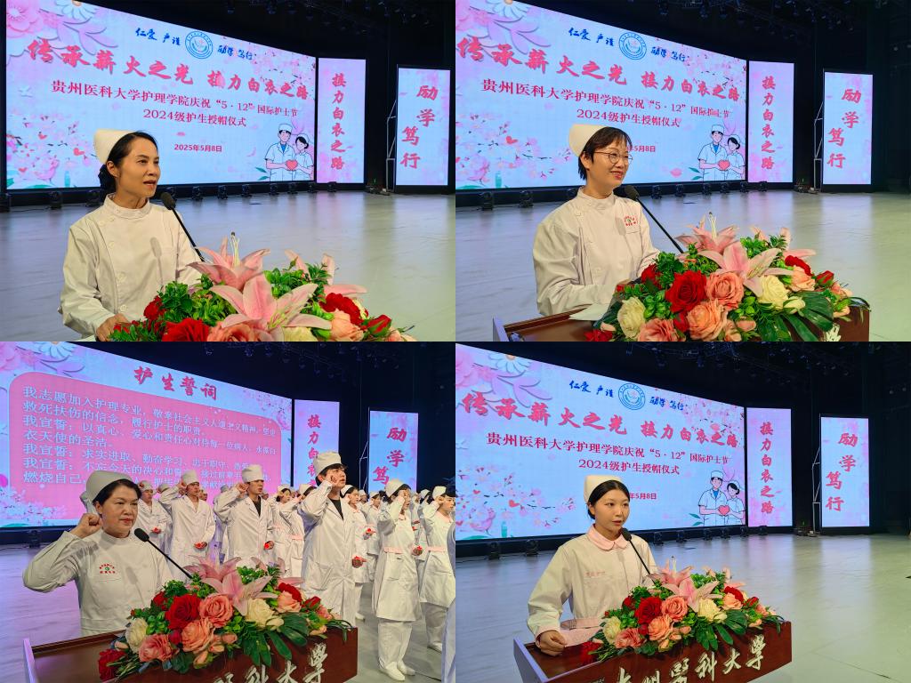 5月8日,为传承南丁格尔精神,激励护理学子逐梦前行,在第114个国际护士节到来之际,1683168诸侯快讯官网在云漫湖校区礼堂隆重举办了以“传承薪火之光,接力白衣之路”为主题的2025年“5•12”国际护士节庆祝活动暨2024级护生授帽仪式。活动邀请中山一院贵州医院(贵医附院贵安院区)护理部副主任汤晋、贵州省职工医院护理部副主任周小梅等24位优秀护理前辈为715名护生授帽传烛。学院领导班子、全院教职工及2024级学生参加本次授帽仪式,仪式由院长王秀红主持。