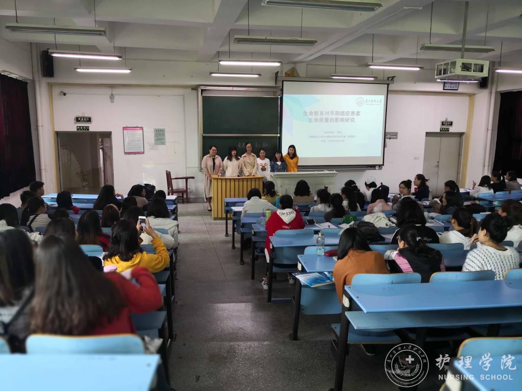 答辩会上,首先由主持人介绍答辩要求,分配学生汇报时间。接着,由2014级实习生每组代表用PPT形式汇报她们的课题设计,答辩评委从多个角度对同学们的课题设计提出问题,同学们对评委专家的提问一一进行了认真的回答。评委、老师们还对学生课题设计不足之处提出了中肯的修改建议。最后,刘志燕作了总结点评,对部分有创新性的课题设计如:“心电监护仪导联线收纳器的设计与应用”等提出了表扬。并鼓励同学们在今后工作中进一步继续完成课题设计的研究。
