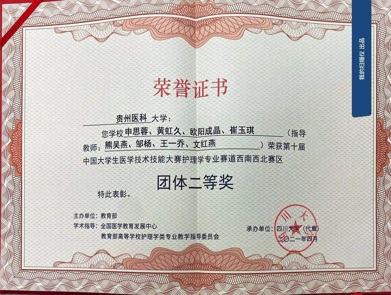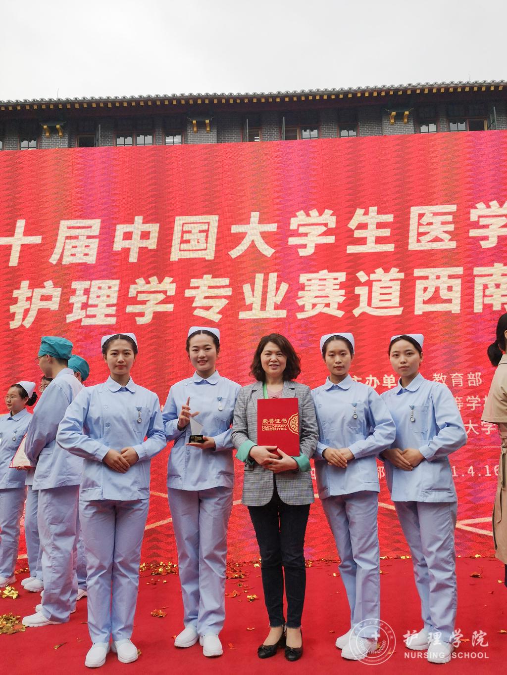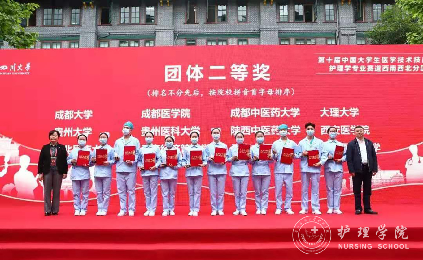 4月17-18日,由教育部主办、教育部高等学校护理学类专业教学指导委员会学术指导、四川大学承办的第十届中国大学生医学技术技能大赛护理学专业赛道西南西北分区赛中,由我校2017级护理专业学生申思蓉、黄虹久、欧阳成晶、崔玉琪组成的1683168诸侯快讯官网代表队,经过两天紧张而激烈的角逐,以扎实的基本功和出色的表现,荣获团体二等奖。
