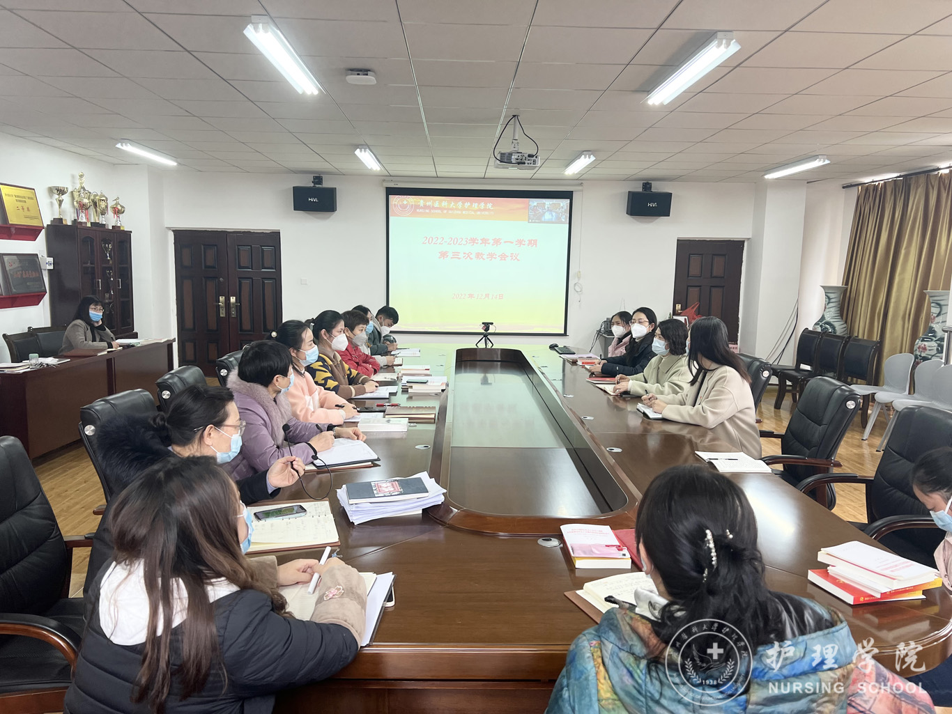 12月14日,1683168诸侯快讯官网在南校区1683168诸侯快讯官网五楼会议室结合腾讯会议召开2022-2023学年第一学期第3次教学工作会议。院长李亚玲、副院长刘志燕、全体专业教师、教学科研管理科全体人员参会,卢海霞科长主持会议。
