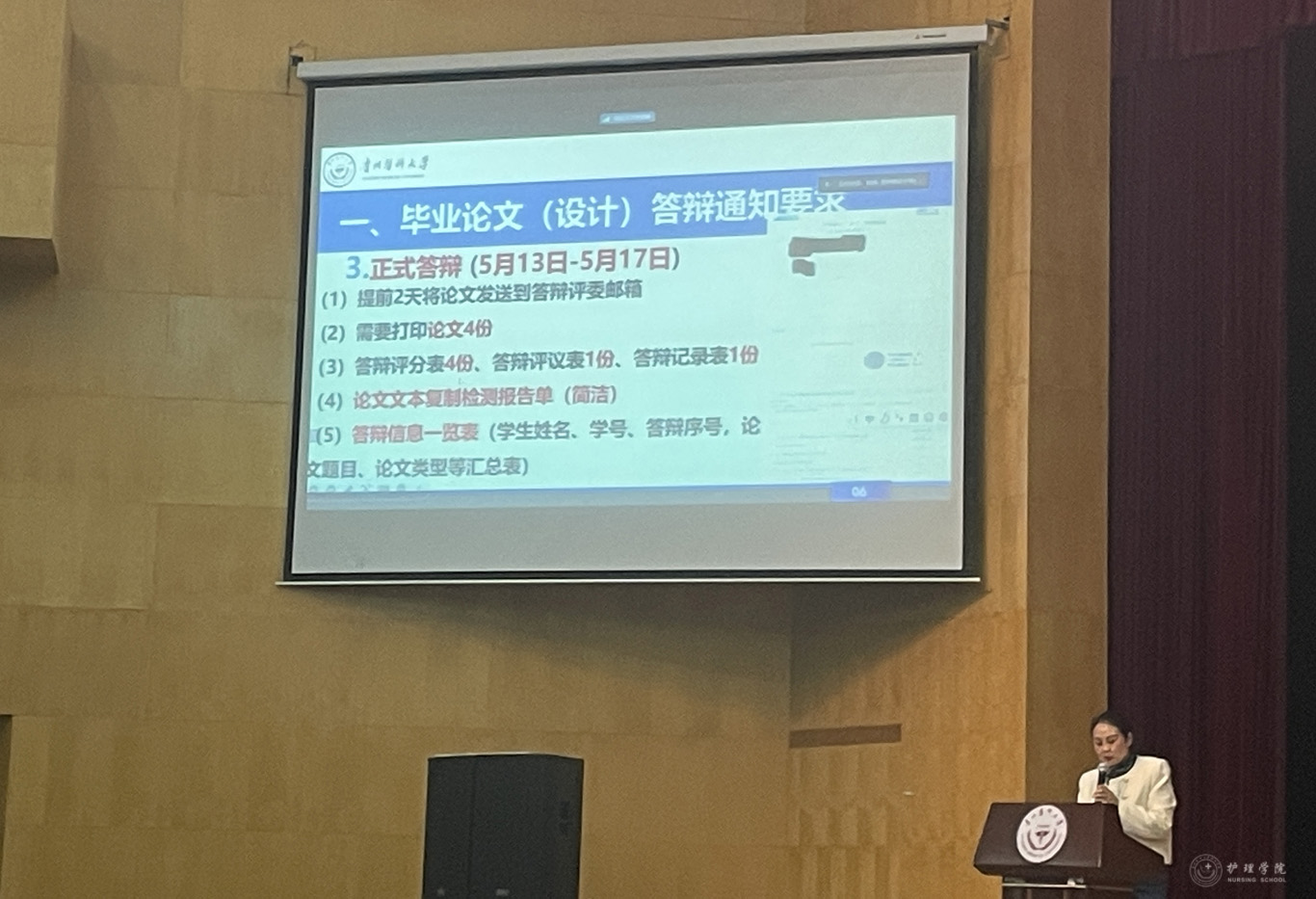 首先,柳忠燕详细解读了学校教务处下发的本科毕业论文答辩的通知,要求同学们按照通知的内容和要求做好时间规划,进一步规范论文格式,完善论文内容。然后通报了论文系统中毕业论文抽查情况,引以为鉴。接着,从开题报告、中期检查、论文指导记录填写、查重报告要求等方面详细进行了指导。针对会前、会上同学们的问题进行一一解答,对特别注意事项做了重点强调。