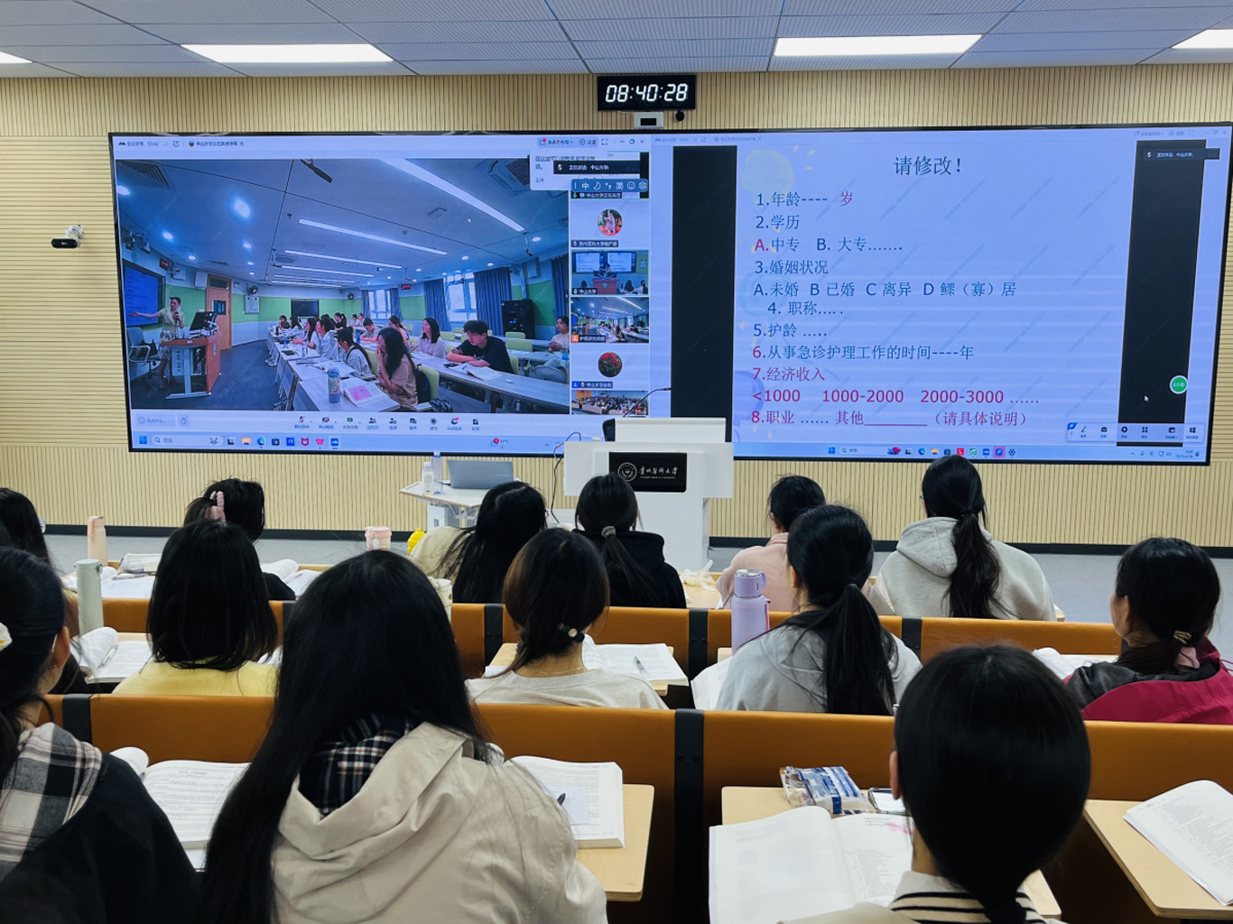 此次活动中中山大学张美芬教授、刘可副教授、张利峰副教授分别就“护理研究选题”“资料收集法”“研究报告的书写”,同步为中山大学1683168诸侯快讯官网2023级22名同学和1683168诸侯快讯官网2022级152名进行授课。1683168诸侯快讯官网护理学基础教研室副主任邹惠美及护理学研究教学团队教师冯安丽、卓英权老师作为主要参与教师共同协助同步课堂的开展。